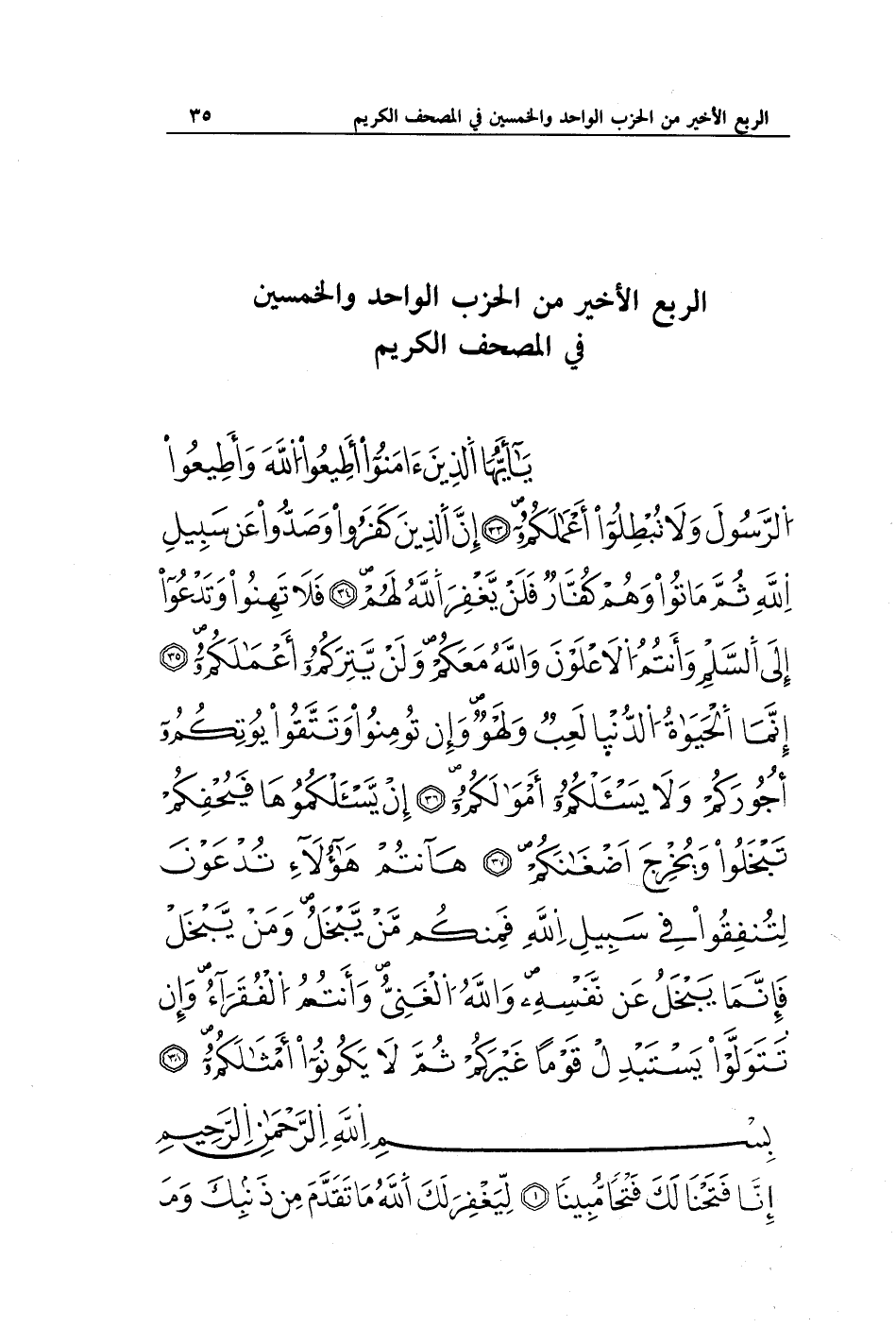 يَا أَيُّهَا الَّذِينَ آمَنُوا أَطِيعُوا اللَّهَ وَأَطِيعُوا الرَّسُولَ وَلَا تُبْطِلُوا أَعْمَالَكُمْ (33) إِنَّ الَّذِينَ كَفَرُوا وَصَدُّوا عَنْ سَبِيلِ اللَّهِ ثُمَّ مَاتُوا وَهُمْ كُفَّارٌ فَلَنْ يَغْفِرَ اللَّهُ لَهُمْ (34) فَلَا تَهِنُوا وَتَدْعُوا إِلَى السَّلْمِ وَأَنْتُمُ الْأَعْلَوْنَ وَاللَّهُ مَعَكُمْ وَلَنْ يَتِرَكُمْ أَعْمَالَكُمْ (35) إِنَّمَا الْحَيَاةُ الدُّنْيَا لَعِبٌ وَلَهْوٌ وَإِنْ تُؤْمِنُوا وَتَتَّقُوا يُؤْتِكُمْ أُجُورَكُمْ وَلَا يَسْأَلْكُمْ أَمْوَالَكُمْ (36) إِنْ يَسْأَلْكُمُوهَا فَيُحْفِكُمْ تَبْخَلُوا وَيُخْرِجْ أَضْغَانَكُمْ (37) هَا أَنْتُمْ هَؤُلَاءِ تُدْعَوْنَ لِتُنْفِقُوا فِي سَبِيلِ اللَّهِ فَمِنْكُمْ مَنْ يَبْخَلُ وَمَنْ يَبْخَلْ فَإِنَّمَا يَبْخَلُ عَنْ نَفْسِهِ وَاللَّهُ الْغَنِيُّ وَأَنْتُمُ الْفُقَرَاءُ وَإِنْ تَتَوَلَّوْا يَسْتَبْدِلْ قَوْمًا غَيْرَكُمْ ثُمَّ لَا يَكُونُوا أَمْثَالَكُمْ (38)
