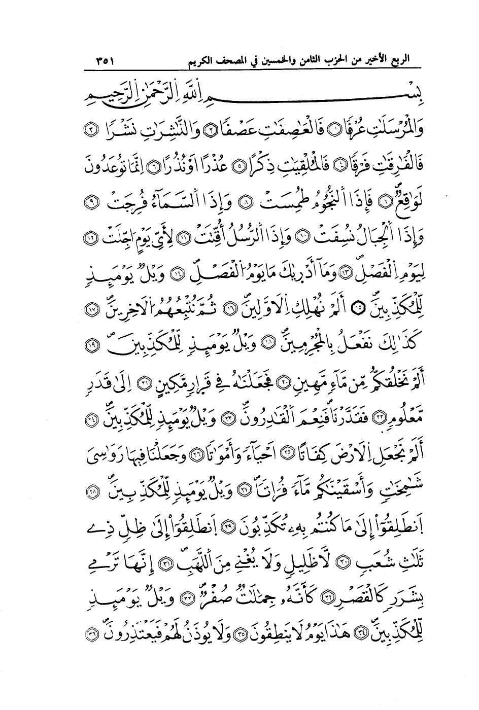 وَالْمُرْسَلَاتِ عُرْفًا (1) فَالْعَاصِفَاتِ عَصْفًا (2) وَالنَّاشِرَاتِ نَشْرًا (3) فَالْفَارِقَاتِ فَرْقًا (4) فَالْمُلْقِيَاتِ ذِكْرًا (5) عُذْرًا أَوْ نُذْرًا (6) إِنَّمَا تُوعَدُونَ لَوَاقِعٌ (7) فَإِذَا النُّجُومُ طُمِسَتْ (8) وَإِذَا السَّمَاءُ فُرِجَتْ (9) وَإِذَا الْجِبَالُ نُسِفَتْ (10) وَإِذَا الرُّسُلُ أُقِّتَتْ (11) لِأَيِّ يَوْمٍ أُجِّلَتْ (12) لِيَوْمِ الْفَصْلِ (13) وَمَا أَدْرَاكَ مَا يَوْمُ الْفَصْلِ (14) وَيْلٌ يَوْمَئِذٍ لِلْمُكَذِّبِينَ (15) أَلَمْ نُهْلِكِ الْأَوَّلِينَ (16) ثُمَّ نُتْبِعُهُمُ الْآخِرِينَ (17) كَذَلِكَ نَفْعَلُ بِالْمُجْرِمِينَ (18) وَيْلٌ يَوْمَئِذٍ لِلْمُكَذِّبِينَ (19) أَلَمْ نَخْلُقْكُمْ مِنْ مَاءٍ مَهِينٍ (20) فَجَعَلْنَاهُ فِي قَرَارٍ مَكِينٍ (21) إِلَى قَدَرٍ مَعْلُومٍ (22) فَقَدَرْنَا فَنِعْمَ الْقَادِرُونَ (23) وَيْلٌ يَوْمَئِذٍ لِلْمُكَذِّبِينَ (24) أَلَمْ نَجْعَلِ الْأَرْضَ كِفَاتًا (25) أَحْيَاءً وَأَمْوَاتًا (26) وَجَعَلْنَا فِيهَا رَوَاسِيَ شَامِخَاتٍ وَأَسْقَيْنَاكُمْ مَاءً فُرَاتًا (27) وَيْلٌ يَوْمَئِذٍ لِلْمُكَذِّبِينَ (28) انْطَلِقُوا إِلَى مَا كُنْتُمْ بِهِ تُكَذِّبُونَ (29) انْطَلِقُوا إِلَى ظِلٍّ ذِي ثَلَاثِ شُعَبٍ (30) لَا ظَلِيلٍ وَلَا يُغْنِي مِنَ اللَّهَبِ (31) إِنَّهَا تَرْمِي بِشَرَرٍ كَالْقَصْرِ (32) كَأَنَّهُ جِمَالَتٌ صُفْرٌ (33) وَيْلٌ يَوْمَئِذٍ لِلْمُكَذِّبِينَ (34) هَذَا يَوْمُ لَا يَنْطِقُونَ (35) وَلَا يُؤْذَنُ لَهُمْ فَيَعْتَذِرُونَ (36)