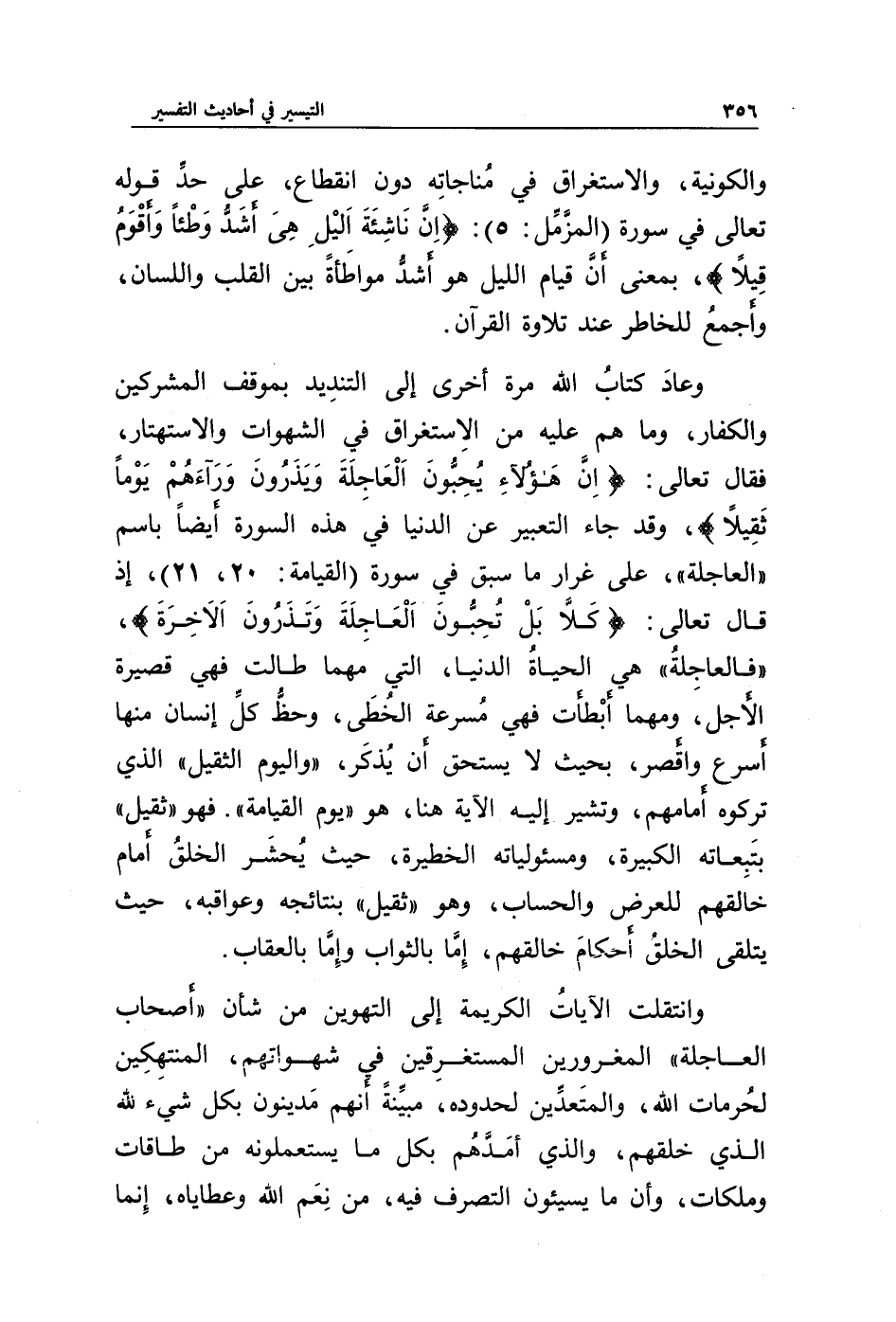 والكونية، والاستغراق في مناجاته دون انقطاع، على حد قوله تعالى في سورة (المزمل: 5): {إِنَّ نَاشِئَةَ اللَّيْلِ هِيَ أَشَدُّ وَطْئًا وَأَقْوَمُ قِيلًا}، بمعنى أن قيام الليل هو أشد مواطأة بين القلب واللسان، وأجمع للخاطر عند تلاوة القرآن.