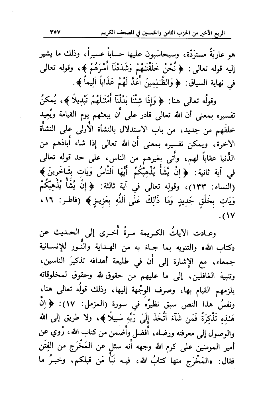 وقوله تعالى هنا: {وَإِذَا شِئْنَا بَدَّلْنَا أَمْثَالَهُمْ تَبْدِيلًا}، يمكن تفسيره بمعنى أن الله تعالى قادر على أن يبعثهم يوم القيامة ويعيد خلقهم من جديد، من باب الاستدلال بالنشأة الأولى على النشأة الآخرة، ويمكن تفسيره بمعنى أن الله تعالى إذا شاء أبادهم من الدنيا عقابا لهم، وأتى بغيرهم من الناس، على حد قوله تعالى في آية ثانية: {إِنْ يَشَأْ يُذْهِبْكُمْ أَيُّهَا النَّاسُ وَيَأْتِ بِآخَرِينَ} (النساء: 133)، وقوله تعالى في آية ثالثة: {إِنْ يَشَأْ يُذْهِبْكُمْ وَيَأْتِ بِخَلْقٍ جَدِيدٍ * وَمَا ذَلِكَ عَلَى اللَّهِ بِعَزِيزٍ} (فاطر: 16، 17).