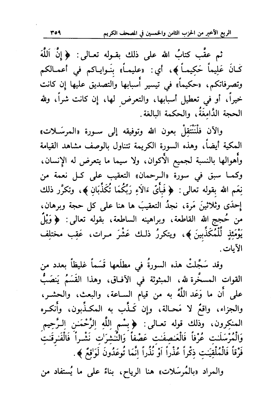 والآن فلننتقل بعون الله وتوفيقه إلى سورة " المرسلات " المكية أيضا، وهذه السورة الكريمة تتناول بالوصف مشاهد القيامة وأهوالها بالنسبة لجميع الأكوان، ولا سيما ما يتعرض له الإنسان، وكما سبق في سورة " الرحمن " التعقيب على كل نعمة من نعم الله بقوله تعالى: {فَبِأَيِّ آلَاءِ رَبِّكُمَا تُكَذِّبَانِ}، وتكرر ذلك إحدى وثلاثين مرة، نجد التعقيب ها هنا على كل حجة وبرهان، من حجج الله القاطعة، وبراهينه الساطعة، بقوله تعالى: {وَيْلٌ يَوْمَئِذٍ لِلْمُكَذِّبِينَ}، ويتكرر ذلك عشر مرات، عقب مختلف الآيات.