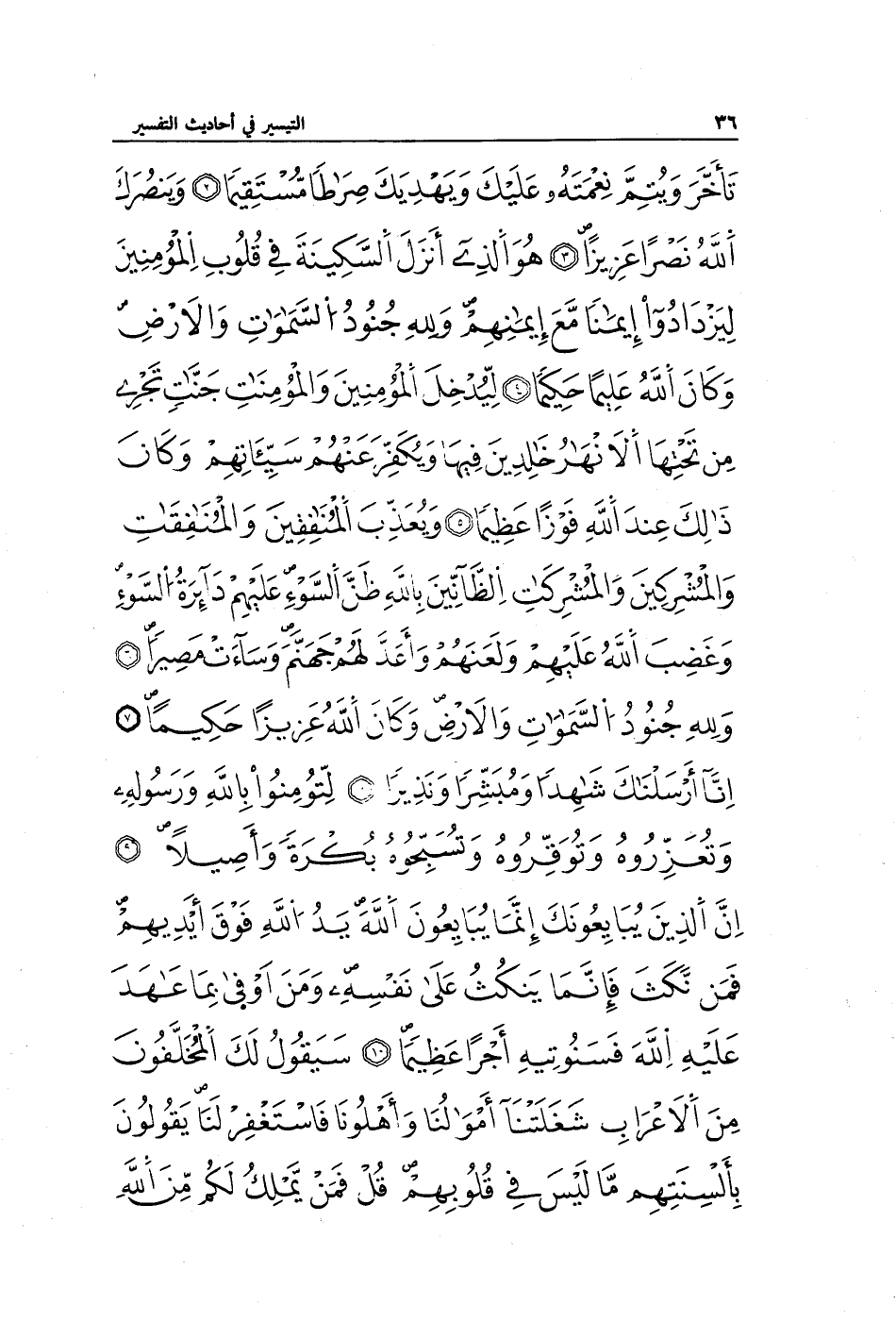 تَأَخَّرَ وَيُتِمَّ نِعْمَتَهُ عَلَيْكَ وَيَهْدِيَكَ صِرَاطًا مُسْتَقِيمًا (2) وَيَنْصُرَكَ اللَّهُ نَصْرًا عَزِيزًا (3) هُوَ الَّذِي أَنْزَلَ السَّكِينَةَ فِي قُلُوبِ الْمُؤْمِنِينَ لِيَزْدَادُوا إِيمَانًا مَعَ إِيمَانِهِمْ وَلِلَّهِ جُنُودُ السَّمَاوَاتِ وَالْأَرْضِ وَكَانَ اللَّهُ عَلِيمًا حَكِيمًا (4) لِيُدْخِلَ الْمُؤْمِنِينَ وَالْمُؤْمِنَاتِ جَنَّاتٍ تَجْرِي مِنْ تَحْتِهَا الْأَنْهَارُ خَالِدِينَ فِيهَا وَيُكَفِّرَ عَنْهُمْ سَيِّئَاتِهِمْ وَكَانَ ذَلِكَ عِنْدَ اللَّهِ فَوْزًا عَظِيمًا (5) وَيُعَذِّبَ الْمُنَافِقِينَ وَالْمُنَافِقَاتِ وَالْمُشْرِكِينَ وَالْمُشْرِكَاتِ الظَّانِّينَ بِاللَّهِ ظَنَّ السَّوْءِ عَلَيْهِمْ دَائِرَةُ السَّوْءِ وَغَضِبَ اللَّهُ عَلَيْهِمْ وَلَعَنَهُمْ وَأَعَدَّ لَهُمْ جَهَنَّمَ وَسَاءَتْ مَصِيرًا (6) وَلِلَّهِ جُنُودُ السَّمَاوَاتِ وَالْأَرْضِ وَكَانَ اللَّهُ عَزِيزًا حَكِيمًا (7) إِنَّا أَرْسَلْنَاكَ شَاهِدًا وَمُبَشِّرًا وَنَذِيرًا (8) لِتُؤْمِنُوا بِاللَّهِ وَرَسُولِهِ وَتُعَزِّرُوهُ وَتُوَقِّرُوهُ وَتُسَبِّحُوهُ بُكْرَةً وَأَصِيلًا (9) إِنَّ الَّذِينَ يُبَايِعُونَكَ إِنَّمَا يُبَايِعُونَ اللَّهَ يَدُ اللَّهِ فَوْقَ أَيْدِيهِمْ فَمَنْ نَكَثَ فَإِنَّمَا يَنْكُثُ عَلَى نَفْسِهِ وَمَنْ أَوْفَى بِمَا عَاهَدَ عَلَيْهُ اللَّهَ فَسَيُؤْتِيهِ أَجْرًا عَظِيمًا (10) سَيَقُولُ لَكَ الْمُخَلَّفُونَ مِنَ الْأَعْرَابِ شَغَلَتْنَا أَمْوَالُنَا وَأَهْلُونَا فَاسْتَغْفِرْ لَنَا يَقُولُونَ بِأَلْسِنَتِهِمْ مَا لَيْسَ فِي قُلُوبِهِمْ قُلْ فَمَنْ يَمْلِكُ لَكُمْ مِنَ اللَّهِ