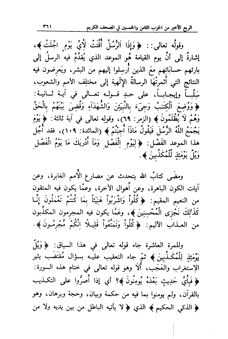 ومضى كتاب الله يتحدث عن مصارع الأمم الغابرة، وعن آيات الكون الباهرة، وعن أهوال الآخرة، وعما يكون فيه المتقون من النعيم المقيم: {كُلُوا وَاشْرَبُوا هَنِيئًا بِمَا كُنْتُمْ تَعْمَلُونَ * إِنَّا كَذَلِكَ نَجْزِي الْمُحْسِنِينَ}، وعما يكون فيه المجرمون المكذبون من العذاب الأليم: {كُلُوا وَتَمَتَّعُوا قَلِيلًا إِنَّكُمْ مُجْرِمُونَ}.