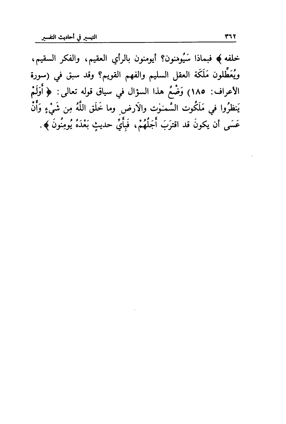خَلْفِهِ} فبماذا سيؤمنون؟ أيؤمنون بالرأي العقيم، والفكر السقيم، ويعطلون ملكة العقل السليم والفهم القويم؟ وقد سبق في سورة (الأعراف: 185) وضع هذا السؤال في سياق قوله تعالى: {أَوَلَمْ يَنْظُرُوا فِي مَلَكُوتِ السَّمَاوَاتِ وَالْأَرْضِ وَمَا خَلَقَ اللَّهُ مِنْ شَيْءٍ وَأَنْ عَسَى أَنْ يَكُونَ قَدِ اقْتَرَبَ أَجَلُهُمْ فَبِأَيِّ حَدِيثٍ بَعْدَهُ يُؤْمِنُونَ}.