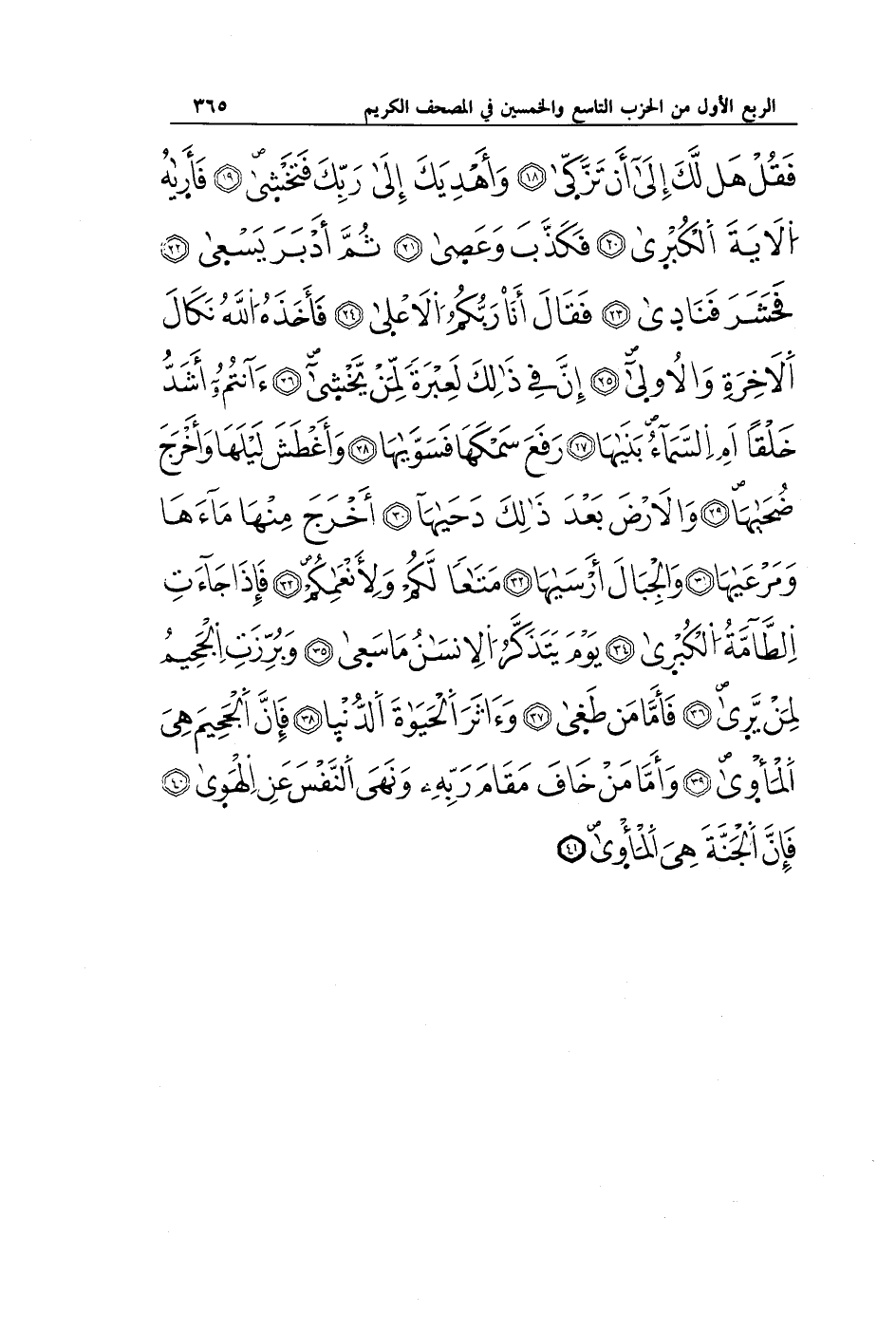فَقُلْ هَلْ لَكَ إِلَى أَنْ تَزَكَّى (18) وَأَهْدِيَكَ إِلَى رَبِّكَ فَتَخْشَى (19) فَأَرَاهُ الْآيَةَ الْكُبْرَى (20) فَكَذَّبَ وَعَصَى (21) ثُمَّ أَدْبَرَ يَسْعَى (22) فَحَشَرَ فَنَادَى (23) فَقَالَ أَنَا رَبُّكُمُ الْأَعْلَى (24) فَأَخَذَهُ اللَّهُ نَكَالَ الْآخِرَةِ وَالْأُولَى (25) إِنَّ فِي ذَلِكَ لَعِبْرَةً لِمَنْ يَخْشَى (26) أَأَنْتُمْ أَشَدُّ خَلْقًا أَمِ السَّمَاءُ بَنَاهَا (27) رَفَعَ سَمْكَهَا فَسَوَّاهَا (28) وَأَغْطَشَ لَيْلَهَا وَأَخْرَجَ ضُحَاهَا (29) وَالْأَرْضَ بَعْدَ ذَلِكَ دَحَاهَا (30) أَخْرَجَ مِنْهَا مَاءَهَا وَمَرْعَاهَا (31) وَالْجِبَالَ أَرْسَاهَا (32) مَتَاعًا لَكُمْ وَلِأَنْعَامِكُمْ (33) فَإِذَا جَاءَتِ الطَّامَّةُ الْكُبْرَى (34) يَوْمَ يَتَذَكَّرُ الْإِنْسَانُ مَا سَعَى (35) وَبُرِّزَتِ الْجَحِيمُ لِمَنْ يَرَى (36) فَأَمَّا مَنْ طَغَى (37) وَآثَرَ الْحَيَاةَ الدُّنْيَا (38) فَإِنَّ الْجَحِيمَ هِيَ الْمَأْوَى (39) وَأَمَّا مَنْ خَافَ مَقَامَ رَبِّهِ وَنَهَى النَّفْسَ عَنِ الْهَوَى (40) فَإِنَّ الْجَنَّةَ هِيَ الْمَأْوَى (41)