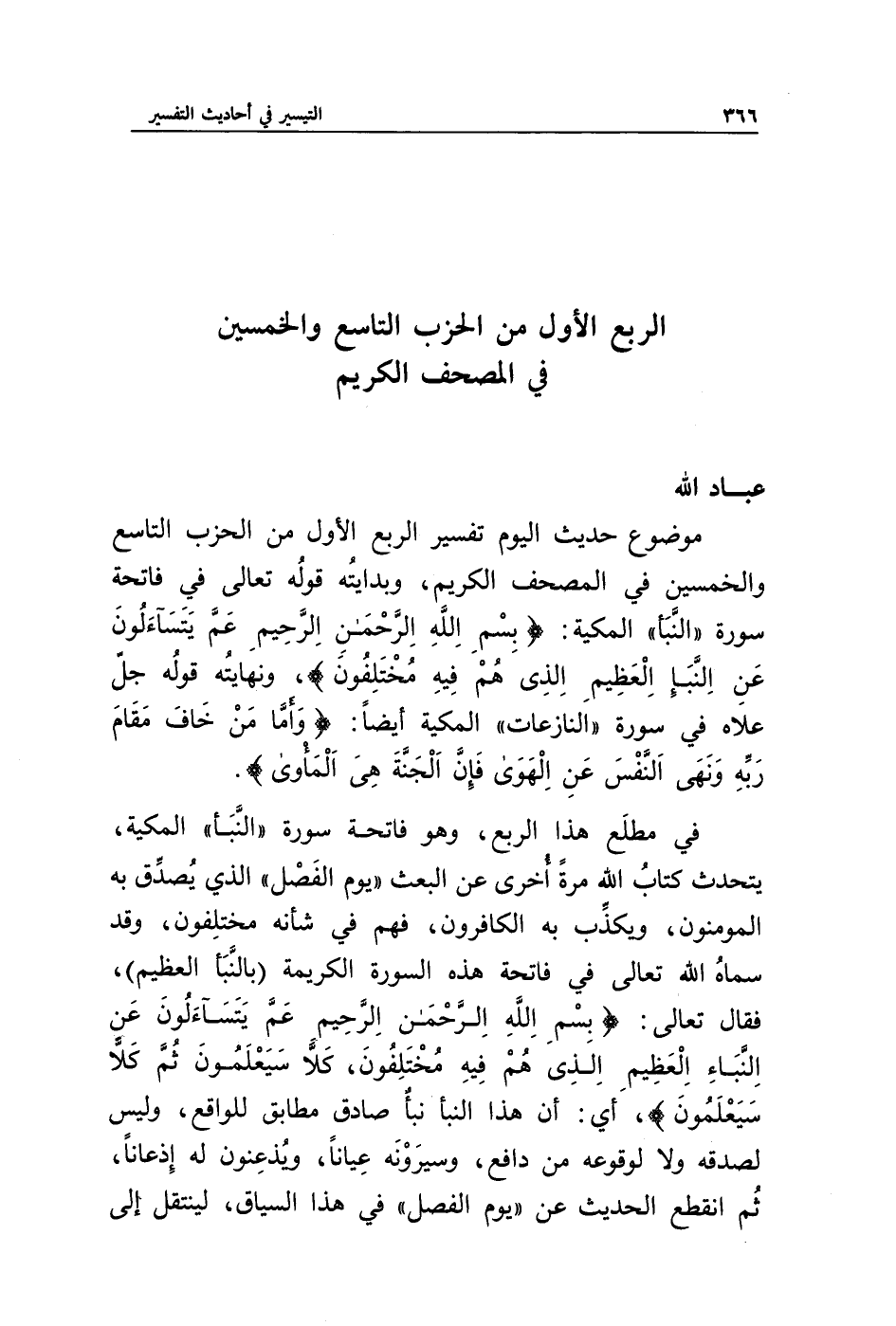 موضوع حديث اليوم تفسير الربع الأول من الحزب التاسع والخمسين في المصحف الكريم، وبدايته قوله تعالى في فاتحة سورة "النبأ" المكية: {بسم الله الرحمن الرحيم عَمَّ يَتَسَاءَلُونَ * عَنِ النَّبَإِ الْعَظِيمِ * الَّذِي هُمْ فِيهِ مُخْتَلِفُونَ}، ونهايته قوله جل علاه في سورة "النازعات" المكية أيضا: {وَأَمَّا مَنْ خَافَ مَقَامَ رَبِّهِ وَنَهَى النَّفْسَ عَنِ الْهَوَى * فَإِنَّ الْجَنَّةَ هِيَ الْمَأْوَى}.