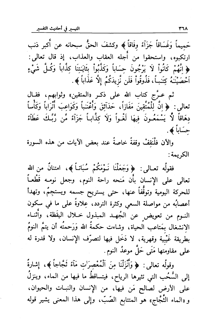وقوله تعالى: {وَأَنْزَلْنَا مِنَ الْمُعْصِرَاتِ مَاءً ثَجَّاجًا}، إشارة إلى السحب التي تثيرها الرياح، فيتساقط ما فيها من الماء، وينزل على الأرض لصالح من فيها، من الإنسان والنبات والحيوان، و " الماء الثجاج " هو المتتابع الصب، وإلى هذا المعنى يشير قوله