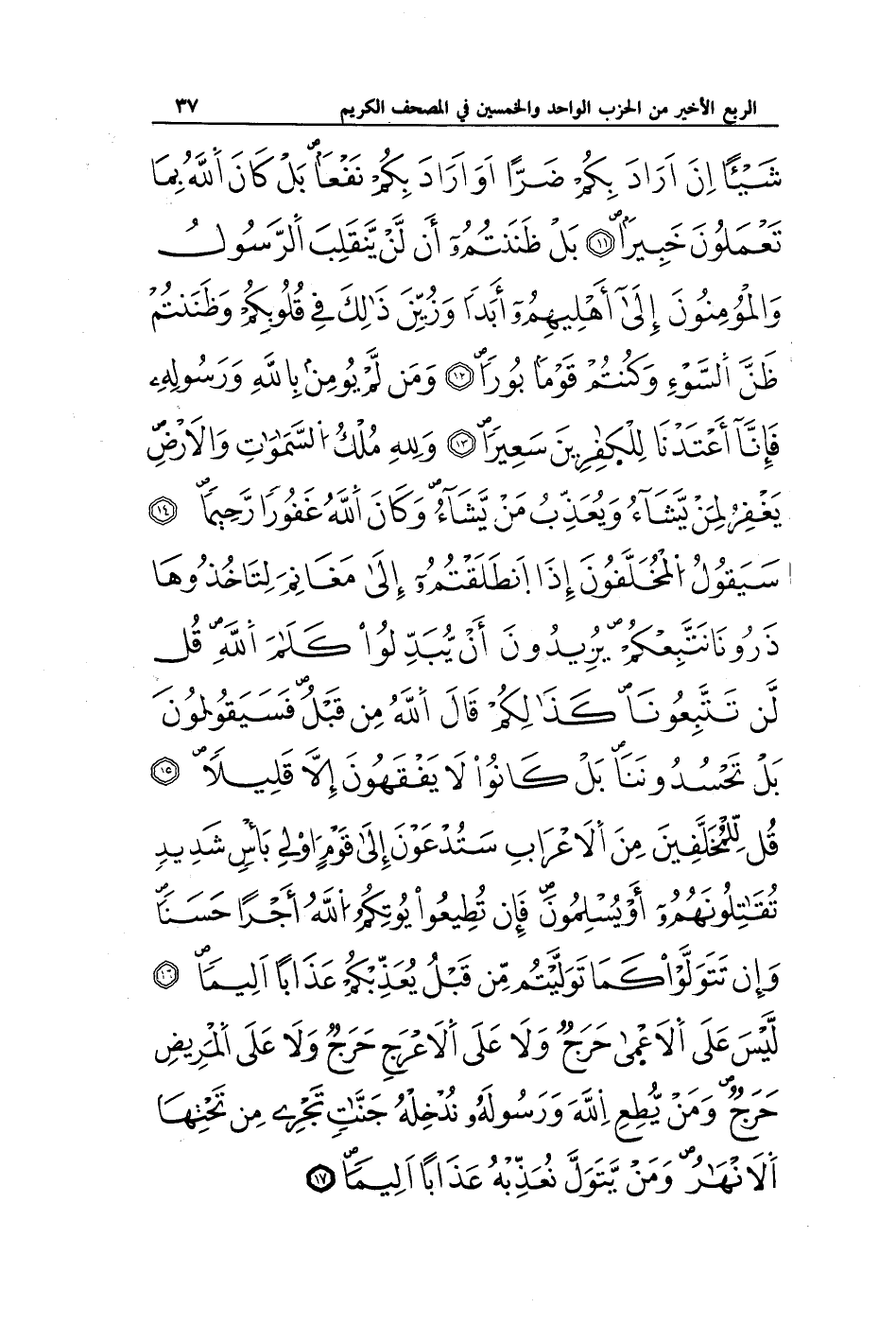 شَيْئًا إِنْ أَرَادَ بِكُمْ ضَرًّا أَوْ أَرَادَ بِكُمْ نَفْعًا بَلْ كَانَ اللَّهُ بِمَا تَعْمَلُونَ خَبِيرًا (11) بَلْ ظَنَنْتُمْ أَنْ لَنْ يَنْقَلِبَ الرَّسُولُ وَالْمُؤْمِنُونَ إِلَى أَهْلِيهِمْ أَبَدًا وَزُيِّنَ ذَلِكَ فِي قُلُوبِكُمْ وَظَنَنْتُمْ ظَنَّ السَّوْءِ وَكُنْتُمْ قَوْمًا بُورًا (12) وَمَنْ لَمْ يُؤْمِنْ بِاللَّهِ وَرَسُولِهِ فَإِنَّا أَعْتَدْنَا لِلْكَافِرِينَ سَعِيرًا (13) وَلِلَّهِ مُلْكُ السَّمَاوَاتِ وَالْأَرْضِ يَغْفِرُ لِمَنْ يَشَاءُ وَيُعَذِّبُ مَنْ يَشَاءُ وَكَانَ اللَّهُ غَفُورًا رَحِيمًا (14) سَيَقُولُ الْمُخَلَّفُونَ إِذَا انْطَلَقْتُمْ إِلَى مَغَانِمَ لِتَأْخُذُوهَا ذَرُونَا نَتَّبِعْكُمْ يُرِيدُونَ أَنْ يُبَدِّلُوا كَلَامَ اللَّهِ قُلْ لَنْ تَتَّبِعُونَا كَذَلِكُمْ قَالَ اللَّهُ مِنْ قَبْلُ فَسَيَقُولُونَ بَلْ تَحْسُدُونَنَا بَلْ كَانُوا لَا يَفْقَهُونَ إِلَّا قَلِيلًا (15) قُلْ لِلْمُخَلَّفِينَ مِنَ الْأَعْرَابِ سَتُدْعَوْنَ إِلَى قَوْمٍ أُولِي بَأْسٍ شَدِيدٍ تُقَاتِلُونَهُمْ أَوْ يُسْلِمُونَ فَإِنْ تُطِيعُوا يُؤْتِكُمُ اللَّهُ أَجْرًا حَسَنًا وَإِنْ تَتَوَلَّوْا كَمَا تَوَلَّيْتُمْ مِنْ قَبْلُ يُعَذِّبْكُمْ عَذَابًا أَلِيمًا (16) لَيْسَ عَلَى الْأَعْمَى حَرَجٌ وَلَا عَلَى الْأَعْرَجِ حَرَجٌ وَلَا عَلَى الْمَرِيضِ حَرَجٌ وَمَنْ يُطِعِ اللَّهَ وَرَسُولَهُ يُدْخِلْهُ جَنَّاتٍ تَجْرِي مِنْ تَحْتِهَا الْأَنْهَارُ وَمَنْ يَتَوَلَّ يُعَذِّبْهُ عَذَابًا أَلِيمًا (17)