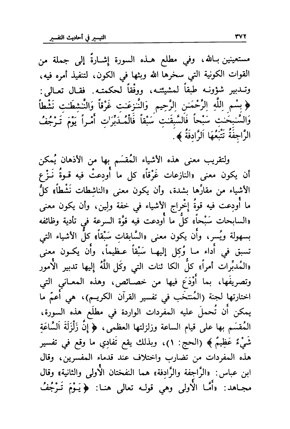 ولتقريب معنى هذه الأشياء المقسم بها من الأذهان يمكن أن يكون معنى {النَّازِعَاتِ غَرْقًا} كل ما أودعت فيه قوة نزع الأشياء من مقارها بشدة، وأن يكون معنى {النَّاشِطَاتِ نَشْطًا} كل ما أودعت فيه قوة إخراج الأشياء في خفة ولين، وأن يكون معنى {السَّابِحَاتِ سَبْحًا} كل ما أودعت فيه قوة السرعة في تأدية وظائفه بسهولة ويسر، وأن يكون معنى {السَّابِقَاتِ سَبْقًا} كل الأشياء التي تسبق في أداء ما وكل إليها سبقا عظيما، وأن يكون معنى {الْمُدَبِّرَاتِ أَمْرًا} كل الكائنات التي وكل الله إليها تدبير الأمور وتصريفها، بما أودع فيها من خصائص، وهذه المعاني التي اختارتها لجنة (المنتخب في تفسير القرآن الكريم)، هي أعم ما يمكن أن تحمل عليه المفردات الواردة في مطلع هذه السورة، المقسم بها على قيام الساعة وزلزلتها العظمى، {إِنَّ زَلْزَلَةَ السَّاعَةِ شَيْءٌ عَظِيمٌ} (الحج: 1)، وبذلك يقع تفادي ما وقع في تفسير هذه المفردات من تضارب واختلاف عند قدماء المفسرين، وقال ابن عباس: " الراجفة والرادفة هما النفختان الأولى والثانية " وقال مجاهد: " أما الأولى وهي قوله تعالى هنا: {يَوْمَ تَرْجُفُ