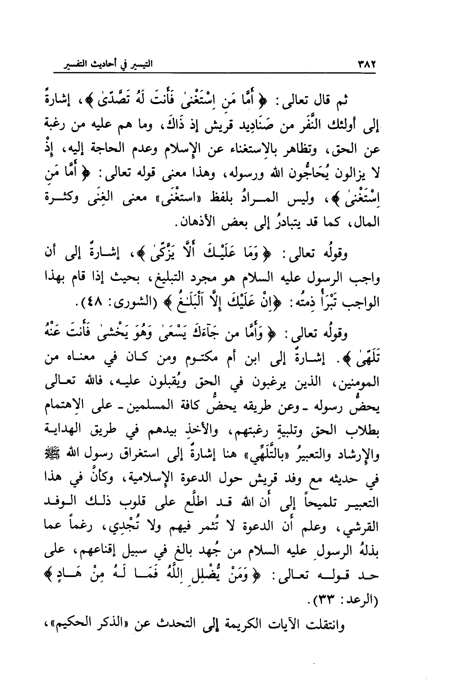 ثم قال تعالى: {أَمَّا مَنِ اسْتَغْنَى * فَأَنْتَ لَهُ تَصَدَّى}، إشارة إلى أولئك النفر من صناديد قريش إذ ذاك، وما هم عليه من رغبة عن الحق، وتظاهر بالاستغناء عن الإسلام وعدم الحاجة إليه، إذ لا يزالون يحاجون الله ورسوله، وهذا معنى قوله تعالى: {أَمَّا مَنِ اسْتَغْنَى}، وليس المراد بلفظ " استغنى " معنى الغنى وكثرة المال، كما قد يتبادر إلى بعض الأذهان.