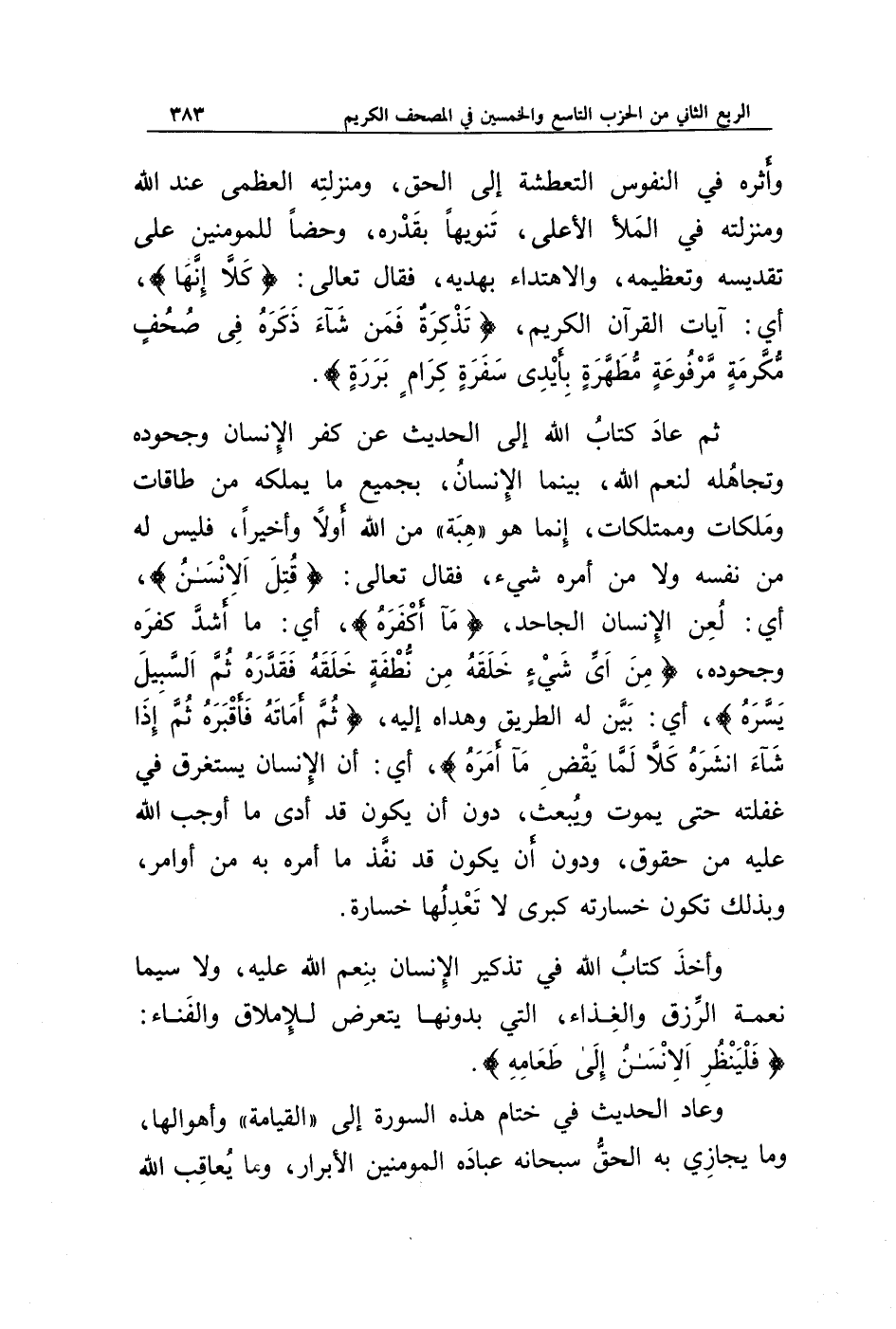 وأثره في النفوس المتعطشة إلى الحق، ومنزلته العظمى عند الله ومنزلته في الملأ الأعلى، تنويها بقدره، وحضا للمؤمنين على تقديسه وتعظيمه، والاهتداء بهديه، فقال تعالى: {كَلَّا إِنَّهَا}، أي: آيات القرآن الكريم، {تَذْكِرَةٌ * فَمَنْ شَاءَ ذَكَرَهُ * فِي صُحُفٍ مُكَرَّمَةٍ * مَرْفُوعَةٍ مُطَهَّرَةٍ * بِأَيْدِي سَفَرَةٍ * كِرَامٍ بَرَرَةٍ}.
