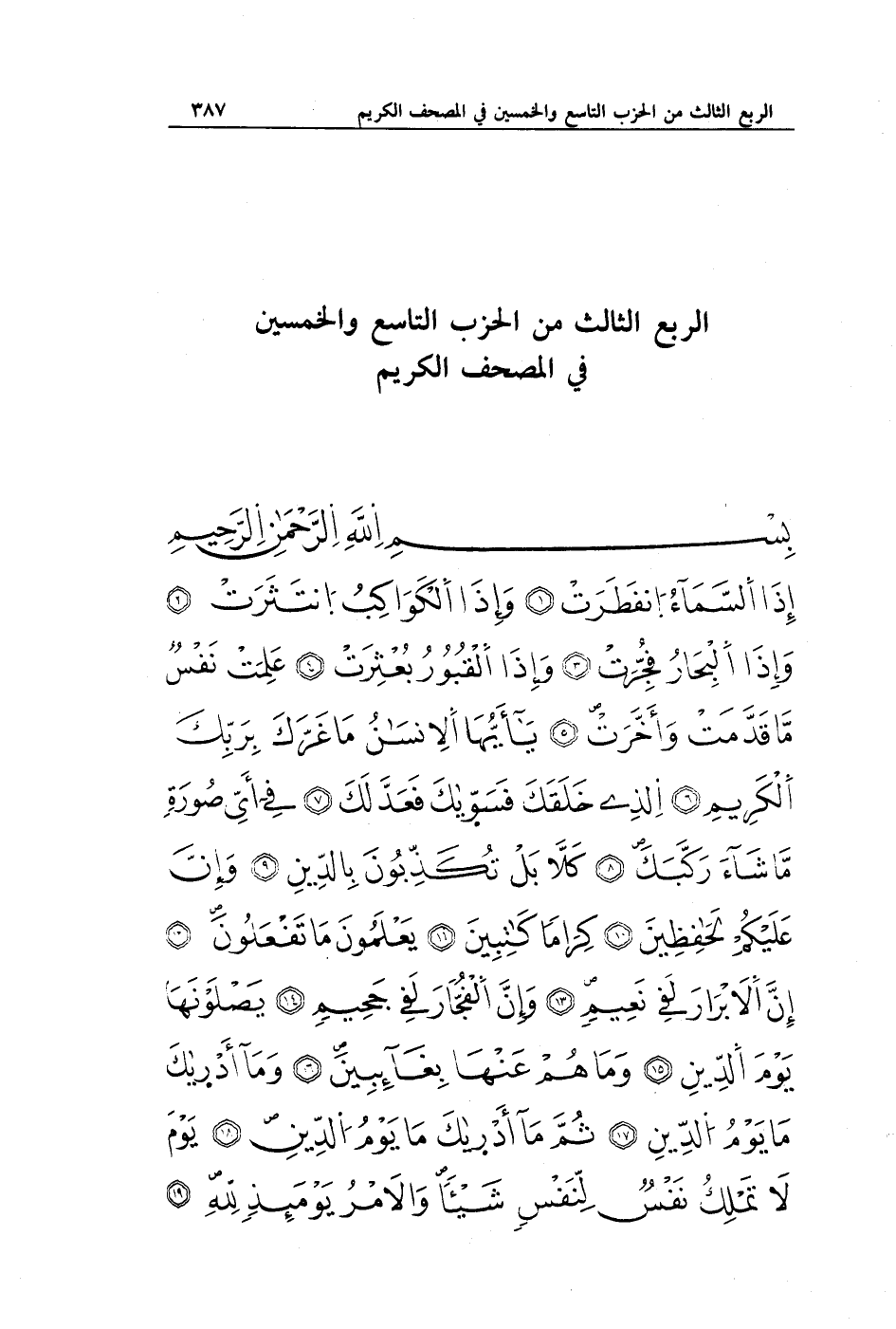 إِذَا السَّمَاءُ انْفَطَرَتْ (1) وَإِذَا الْكَوَاكِبُ انْتَثَرَتْ (2) وَإِذَا الْبِحَارُ فُجِّرَتْ (3) وَإِذَا الْقُبُورُ بُعْثِرَتْ (4) عَلِمَتْ نَفْسٌ مَا قَدَّمَتْ وَأَخَّرَتْ (5) يَا أَيُّهَا الْإِنْسَانُ مَا غَرَّكَ بِرَبِّكَ الْكَرِيمِ (6) الَّذِي خَلَقَكَ فَسَوَّاكَ فَعَدَلَكَ (7) فِي أَيِّ صُورَةٍ مَا شَاءَ رَكَّبَكَ (8) كَلَّا بَلْ تُكَذِّبُونَ بِالدِّينِ (9) وَإِنَّ عَلَيْكُمْ لَحَافِظِينَ (10) كِرَامًا كَاتِبِينَ (11) يَعْلَمُونَ مَا تَفْعَلُونَ (12) إِنَّ الْأَبْرَارَ لَفِي نَعِيمٍ (13) وَإِنَّ الْفُجَّارَ لَفِي جَحِيمٍ (14) يَصْلَوْنَهَا يَوْمَ الدِّينِ (15) وَمَا هُمْ عَنْهَا بِغَائِبِينَ (16) وَمَا أَدْرَاكَ مَا يَوْمُ الدِّينِ (17) ثُمَّ مَا أَدْرَاكَ مَا يَوْمُ الدِّينِ (18) يَوْمَ لَا تَمْلِكُ نَفْسٌ لِنَفْسٍ شَيْئًا وَالْأَمْرُ يَوْمَئِذٍ لِلَّهِ (19)