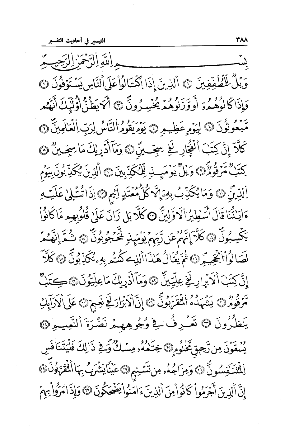 وَيْلٌ لِلْمُطَفِّفِينَ (1) الَّذِينَ إِذَا اكْتَالُوا عَلَى النَّاسِ يَسْتَوْفُونَ (2) وَإِذَا كَالُوهُمْ أَوْ وَزَنُوهُمْ يُخْسِرُونَ (3) أَلَا يَظُنُّ أُولَئِكَ أَنَّهُمْ مَبْعُوثُونَ (4) لِيَوْمٍ عَظِيمٍ (5) يَوْمَ يَقُومُ النَّاسُ لِرَبِّ الْعَالَمِينَ (6) كَلَّا إِنَّ كِتَابَ الْفُجَّارِ لَفِي سِجِّينٍ (7) وَمَا أَدْرَاكَ مَا سِجِّينٌ (8) كِتَابٌ مَرْقُومٌ (9) وَيْلٌ يَوْمَئِذٍ لِلْمُكَذِّبِينَ (10) الَّذِينَ يُكَذِّبُونَ بِيَوْمِ الدِّينِ (11) وَمَا يُكَذِّبُ بِهِ إِلَّا كُلُّ مُعْتَدٍ أَثِيمٍ (12) إِذَا تُتْلَى عَلَيْهِ آيَاتُنَا قَالَ أَسَاطِيرُ الْأَوَّلِينَ (13) كَلَّا بَلْ رَانَ عَلَى قُلُوبِهِمْ مَا كَانُوا يَكْسِبُونَ (14) كَلَّا إِنَّهُمْ عَنْ رَبِّهِمْ يَوْمَئِذٍ لَمَحْجُوبُونَ (15) ثُمَّ إِنَّهُمْ لَصَالُو الْجَحِيمِ (16) ثُمَّ يُقَالُ هَذَا الَّذِي كُنْتُمْ بِهِ تُكَذِّبُونَ (17) كَلَّا إِنَّ كِتَابَ الْأَبْرَارِ لَفِي عِلِّيِّينَ (18) وَمَا أَدْرَاكَ مَا عِلِّيُّونَ (19) كِتَابٌ مَرْقُومٌ (20) يَشْهَدُهُ الْمُقَرَّبُونَ (21) إِنَّ الْأَبْرَارَ لَفِي نَعِيمٍ (22) عَلَى الْأَرَائِكِ يَنْظُرُونَ (23) تَعْرِفُ فِي وُجُوهِهِمْ نَضْرَةَ النَّعِيمِ (24) يُسْقَوْنَ مِنْ رَحِيقٍ مَخْتُومٍ (25) خِتَامُهُ مِسْكٌ وَفِي ذَلِكَ فَلْيَتَنَافَسِ الْمُتَنَافِسُونَ (26) وَمِزَاجُهُ مِنْ تَسْنِيمٍ (27) عَيْنًا يَشْرَبُ بِهَا الْمُقَرَّبُونَ (28) إِنَّ الَّذِينَ أَجْرَمُوا كَانُوا مِنَ الَّذِينَ آمَنُوا يَضْحَكُونَ (29) وَإِذَا مَرُّوا بِهِمْ