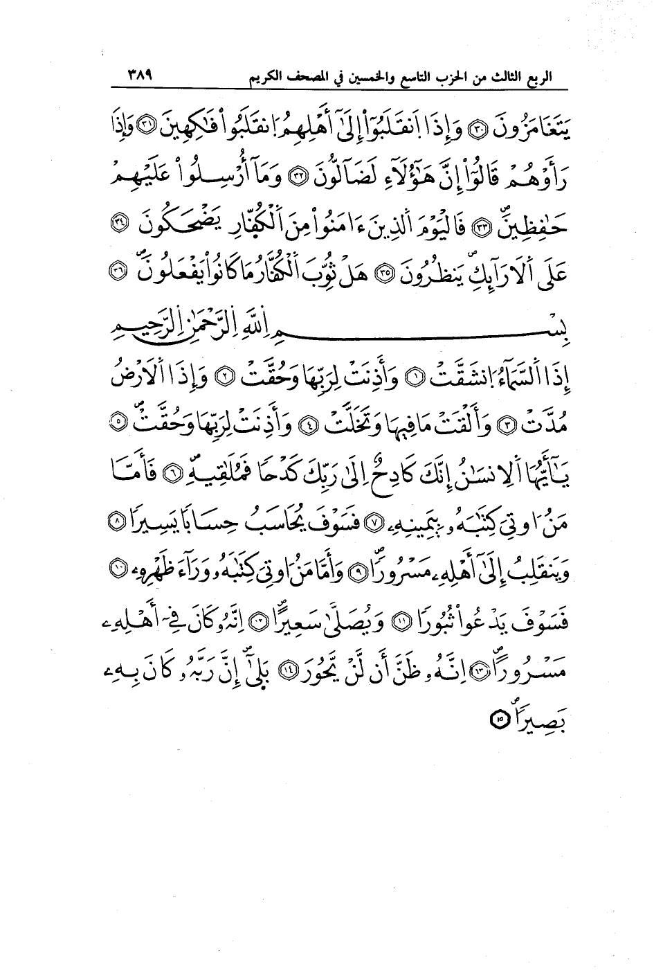 إِذَا السَّمَاءُ انْشَقَّتْ (1) وَأَذِنَتْ لِرَبِّهَا وَحُقَّتْ (2) وَإِذَا الْأَرْضُ مُدَّتْ (3) وَأَلْقَتْ مَا فِيهَا وَتَخَلَّتْ (4) وَأَذِنَتْ لِرَبِّهَا وَحُقَّتْ (5) يَا أَيُّهَا الْإِنْسَانُ إِنَّكَ كَادِحٌ إِلَى رَبِّكَ كَدْحًا فَمُلَاقِيهِ (6) فَأَمَّا مَنْ أُوتِيَ كِتَابَهُ بِيَمِينِهِ (7) فَسَوْفَ يُحَاسَبُ حِسَابًا يَسِيرًا (8) وَيَنْقَلِبُ إِلَى أَهْلِهِ مَسْرُورًا (9) وَأَمَّا مَنْ أُوتِيَ كِتَابَهُ وَرَاءَ ظَهْرِهِ (10) فَسَوْفَ يَدْعُو ثُبُورًا (11) وَيَصْلَى سَعِيرًا (12) إِنَّهُ كَانَ فِي أَهْلِهِ مَسْرُورًا (13) إِنَّهُ ظَنَّ أَنْ لَنْ يَحُورَ (14) بَلَى إِنَّ رَبَّهُ كَانَ بِهِ بَصِيرًا (15)