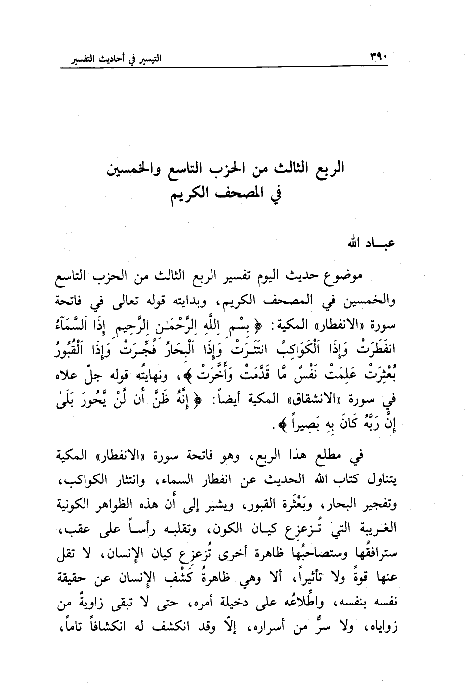موضوع حديث اليوم تفسير الربع الثالث من الحزب التاسع والخمسين في المصحف الكريم، وبدايته قوله تعالى في فاتحة سورة "الانفطار" المكية: {بسم الله الرحمن الرحيم إِذَا السَّمَاءُ انْفَطَرَتْ * وَإِذَا الْكَوَاكِبُ انْتَثَرَتْ * وَإِذَا الْبِحَارُ فُجِّرَتْ * وَإِذَا الْقُبُورُ بُعْثِرَتْ * عَلِمَتْ نَفْسٌ مَا قَدَّمَتْ وَأَخَّرَتْ}، ونهايته قوله جل علاه في سورة "الانشقاق" المكية أيضا: {إِنَّهُ ظَنَّ أَنْ لَنْ يَحُورَ * بَلَى إِنَّ رَبَّهُ كَانَ بِهِ بَصِيرًا}.