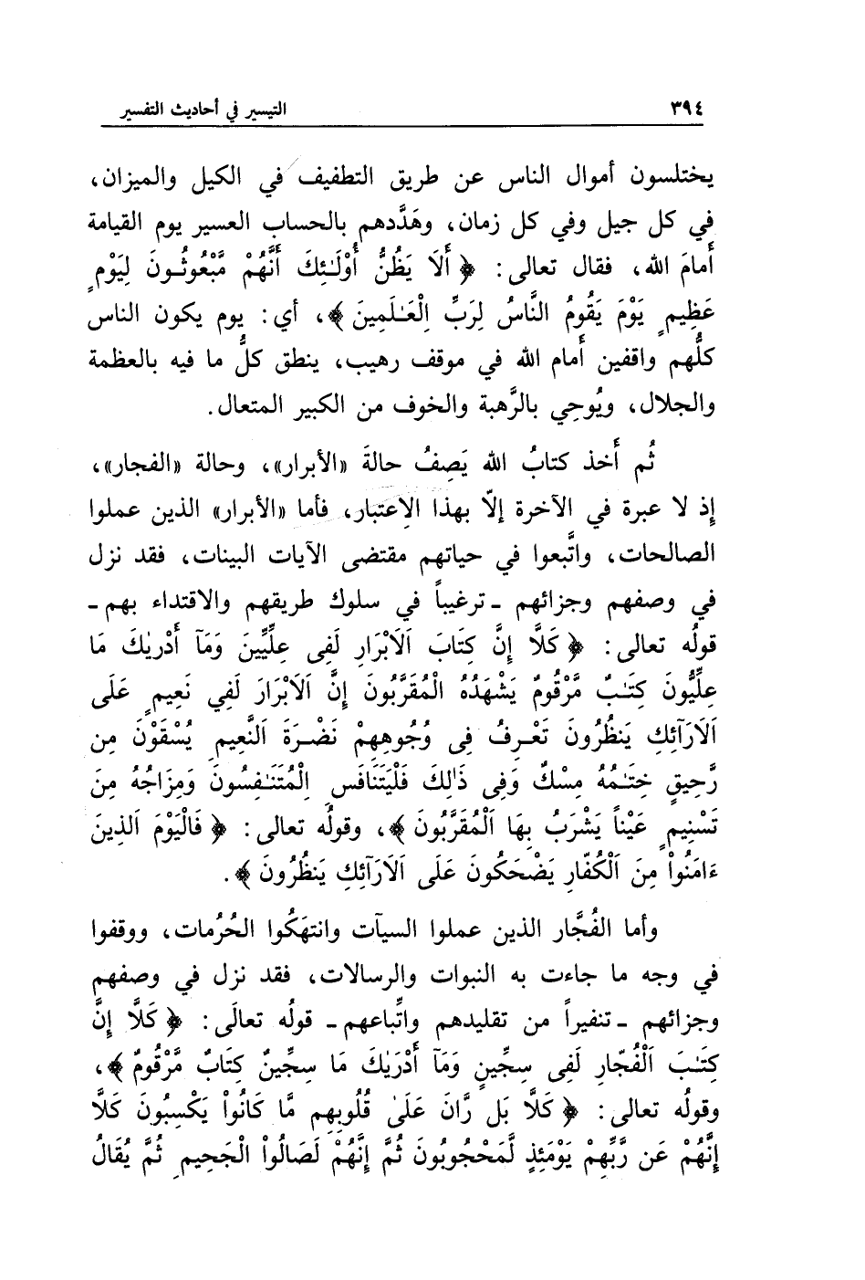 ثم أخذ كتاب الله يصف حالة " الأبرار " وحالة " الفجار "، إذ لا عبرة في الآخرة إلا بهذا الاعتبار، فأما " الأبرار " الذين عملوا الصالحات، واتبعوا في حياتهم مقتضى الآيات البينات، فقد نزل في وصفهم وجزائهم -ترغيبا في سلوك طريقهم والاقتداء بهم- قوله تعالى: {كَلَّا إِنَّ كِتَابَ الْأَبْرَارِ لَفِي عِلِّيِّينَ * وَمَا أَدْرَاكَ مَا عِلِّيُّونَ * كِتَابٌ مَرْقُومٌ * يَشْهَدُهُ الْمُقَرَّبُونَ * إِنَّ الْأَبْرَارَ لَفِي نَعِيمٍ * عَلَى الْأَرَائِكِ يَنْظُرُونَ * تَعْرِفُ فِي وُجُوهِهِمْ نَضْرَةَ النَّعِيمِ * يُسْقَوْنَ مِنْ رَحِيقٍ مَخْتُومٍ * خِتَامُهُ مِسْكٌ وَفِي ذَلِكَ فَلْيَتَنَافَسِ الْمُتَنَافِسُونَ * وَمِزَاجُهُ مِنْ تَسْنِيمٍ * عَيْنًا يَشْرَبُ بِهَا الْمُقَرَّبُونَ}، وقوله تعالى: {فَالْيَوْمَ الَّذِينَ آمَنُوا مِنَ الْكُفَّارِ يَضْحَكُونَ * عَلَى الْأَرَائِكِ يَنْظُرُونَ}.
