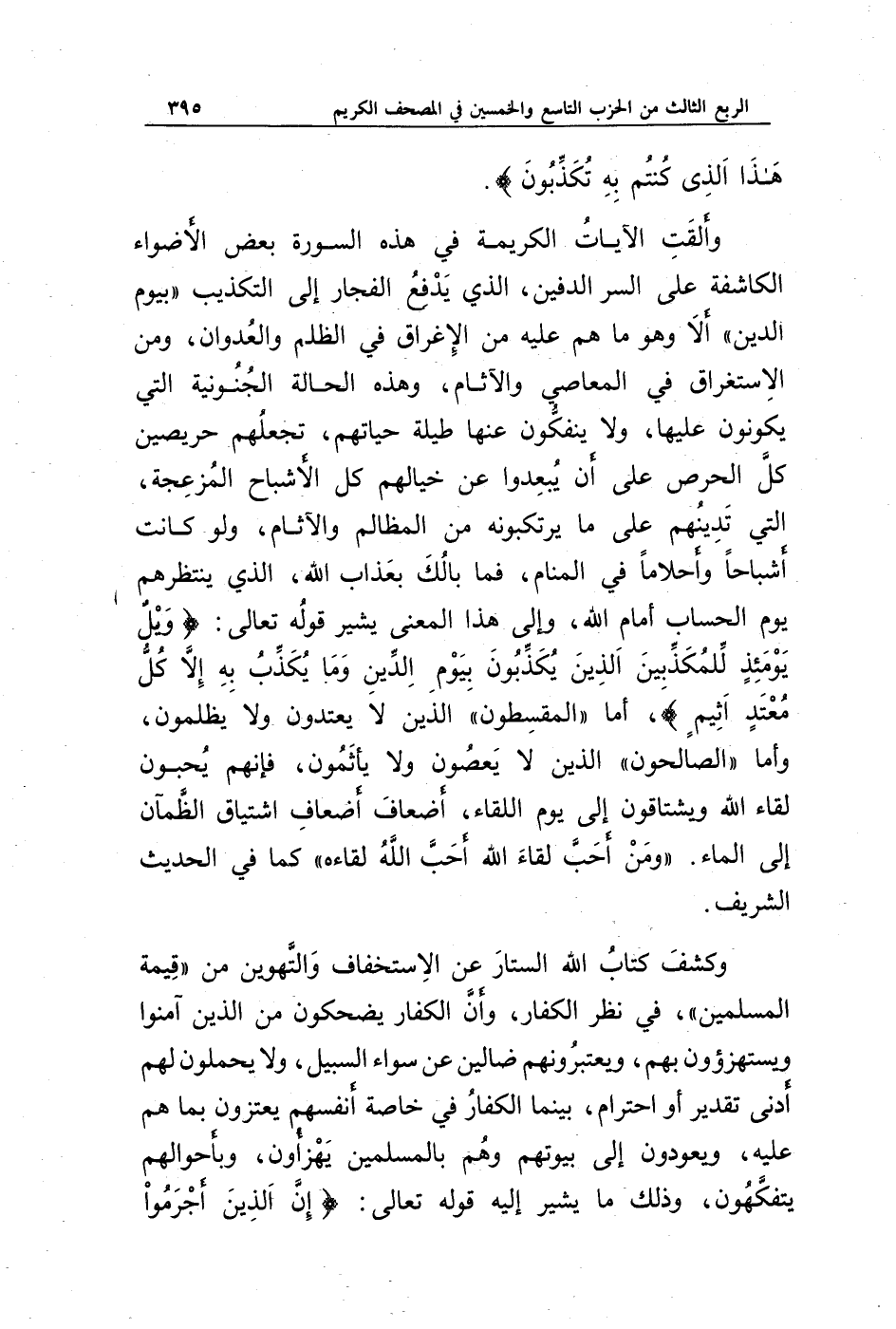 وألقت الآيات الكريمة في هذه السورة بعض الأضواء الكاشفة على السر الدفين، الذي يدفع الفجار إلى التكذيب " بيوم الدين " ألا وهو ما هم عليه من الإغراق في الظلم والعدوان، ومن الاستغراق في المعاصي والآثام، وهذه الحالة الجنونية التي يكونون عليها، ولا ينفكون عنها طيلة حياتهم، تجعلهم حريصين كل الحرص على أن يبعدوا عن خيالهم كل الأشباح المزعجة، التي تدينهم على ما يرتكبونه من المظالم والآثام، ولو كانت أشباحا وأحلاما في المنام، فما بالك بعذاب الله، الذي ينتظرهم يوم الحساب أمام الله، وإلى هذا المعنى يشير قوله تعالى: {وَيْلٌ يَوْمَئِذٍ لِلْمُكَذِّبِينَ * الَّذِينَ يُكَذِّبُونَ بِيَوْمِ الدِّينِ * وَمَا يُكَذِّبُ بِهِ إِلَّا كُلُّ مُعْتَدٍ أَثِيمٍ}، أما " المقسطون " الذين لا يعتدون ولا يظلمون، وأما " الصالحون " الذين لا يعصون ولا يأثمون، فإنهم يحبون لقاء الله ويشتاقون إلى يوم اللقاء، أضعاف أضعاف اشتياق الظمآن إلى الماء. " ومن أحب لقاء الله أحب الله لقاءه " كما في الحديث الشريف.
