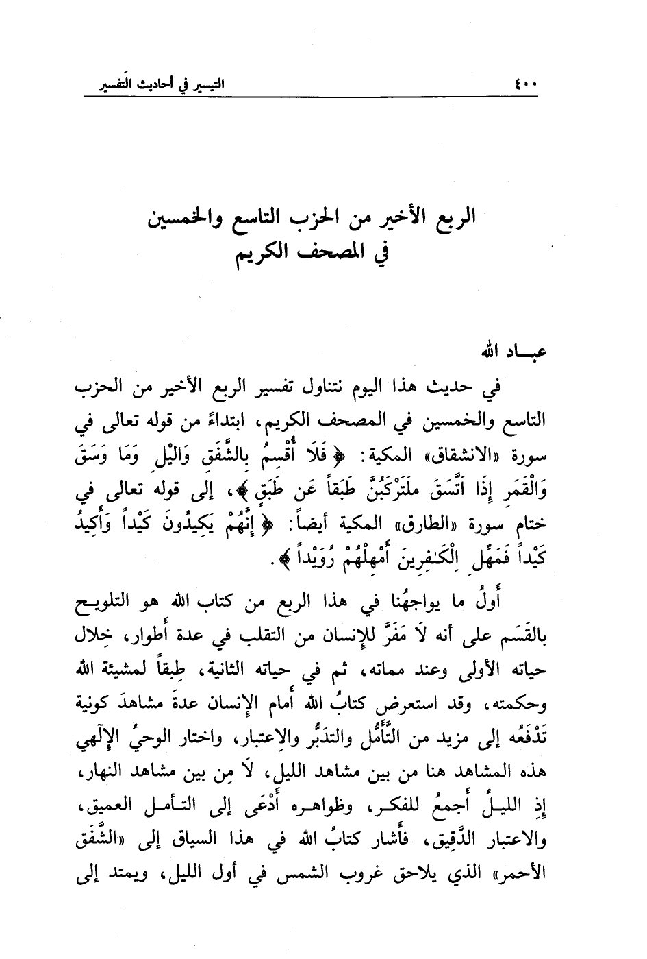 في حديث هذا اليوم نتناول تفسير الربع الأخير من الحزب التاسع والخمسين في المصحف الكريم، ابتداء من قوله تعالى في سورة "الانشقاق" المكية: {فَلَا أُقْسِمُ بِالشَّفَقِ * وَاللَّيْلِ وَمَا وَسَقَ * وَالْقَمَرِ إِذَا اتَّسَقَ * لَتَرْكَبُنَّ طَبَقًا عَنْ طَبَقٍ}، إلى قوله تعالى في ختام سورة "الطارق" المكية أيضا: {إِنَّهُمْ يَكِيدُونَ كَيْدًا * وَأَكِيدُ كَيْدًا * فَمَهِّلِ الْكَافِرِينَ أَمْهِلْهُمْ رُوَيْدًا}.