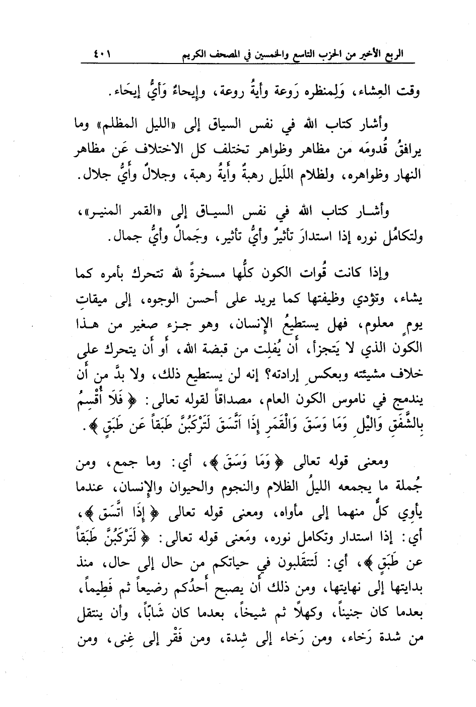 وإذا كانت قوات الكون كلها مسخرة لله تتحرك بأمره كما يشاء، وتؤدي وظيفتها كما يريد على أحسن الوجوه، إلى ميقات يوم معلوم، فهل يستطيع الإنسان، وهو جزء صغير من هذا الكون الذي لا يتجزأ، أن يفلت من قبضة الله، أو أن يتحرك على خلاف مشيئته وبعكس إرادته؟ إنه لن يستطيع ذلك، ولا بد من أن يندمج في ناموس الكون العام، مصداقا لقوله تعالى: {فَلَا أُقْسِمُ بِالشَّفَقِ * وَاللَّيْلِ وَمَا وَسَقَ * وَالْقَمَرِ إِذَا اتَّسَقَ * لَتَرْكَبُنَّ طَبَقًا عَنْ طَبَقٍ}.