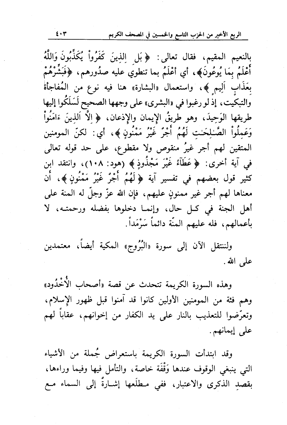 بالنعيم المقيم، فقال تعالى: {بَلِ الَّذِينَ كَفَرُوا يُكَذِّبُونَ * وَاللَّهُ أَعْلَمُ بِمَا يُوعُونَ}، أي أعلم بما تنطوي عليه صدورهم، {فَبَشِّرْهُمْ بِعَذَابٍ أَلِيمٍ}، واستعمال " البشارة " هنا فيه نوع من المفاجأة والتبكيت، إذ لو رغبوا في " البشرى " على وجهها الصحيح لسلكوا إليها طريقها الوحيد، وهو طريق الإيمان والإذعان، {إِلَّا الَّذِينَ آمَنُوا وَعَمِلُوا الصَّالِحَاتِ لَهُمْ أَجْرٌ غَيْرُ مَمْنُونٍ}، أي: لكن المؤمنين المتقين لهم أجر غير منقوص ولا مقطوع، على حد قوله تعالى في آية أخرى: {عَطَاءً غَيْرَ مَجْذُوذٍ} (هود: 108)، وانتقد ابن كثير قول بعضهم في تفسير آية {لَهُمْ أَجْرٌ غَيْرُ مَمْنُونٍ}، أن معناها لهم أجر غير ممنون عليهم، فإن الله عز وجل له المنة على أهل الجنة في كل حال، وإنما دخلوها بفضله ورحمته، لا بأعمالهم، فله عليهم المنة دائما سرمدا.