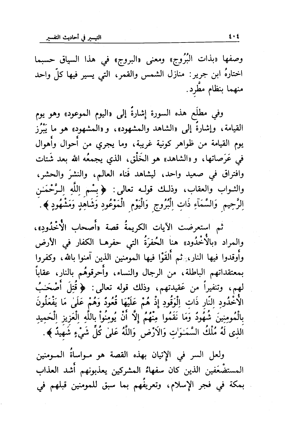 وفي مطلع هذه السورة إشارة إلى " اليوم الموعود " وهو يوم القيامة، وإشارة إلى " الشاهد والمشهود "، و " المشهود " هو ما يبرز يوم القيامة من ظواهر كونية غريبة، وما يجري من أحوال وأهوال في عرصاتها، و " الشاهد " هو الخلق، الذي يجمعه الله بعد شتات وافتراق في صعيد واحد، ليشاهد فناء العالم، والنشر والحشر، والثواب والعقاب، وذلك قوله تعالى: {بسم الله الرحمن الرحيم وَالسَّمَاءِ ذَاتِ الْبُرُوجِ * وَالْيَوْمِ الْمَوْعُودِ * وَشَاهِدٍ وَمَشْهُودٍ}.