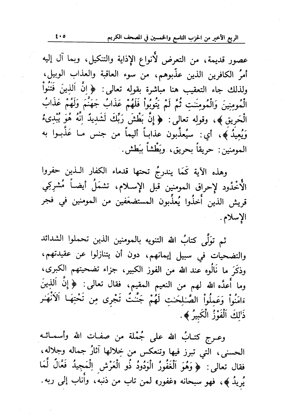 عصور قديمة، من التعرض لأنواع الإذاية والتنكيل، وبما آل إليه أمر الكافرين الذين عذبوهم، من سوء العاقبة والعذاب الوبيل، ولذلك جاء التعقيب هنا مباشرة بقوله تعالى: {إِنَّ الَّذِينَ فَتَنُوا الْمُؤْمِنِينَ وَالْمُؤْمِنَاتِ ثُمَّ لَمْ يَتُوبُوا فَلَهُمْ عَذَابُ جَهَنَّمَ وَلَهُمْ عَذَابُ الْحَرِيقِ}، وقوله تعالى: {إِنَّ بَطْشَ رَبِّكَ لَشَدِيدٌ * إِنَّهُ هُوَ يُبْدِئُ وَيُعِيدُ}، أي: سيعذبون عذابا أليما من جنس ما عذبوا به المؤمنين: حريقا بحريق، وبطشا ببطش.