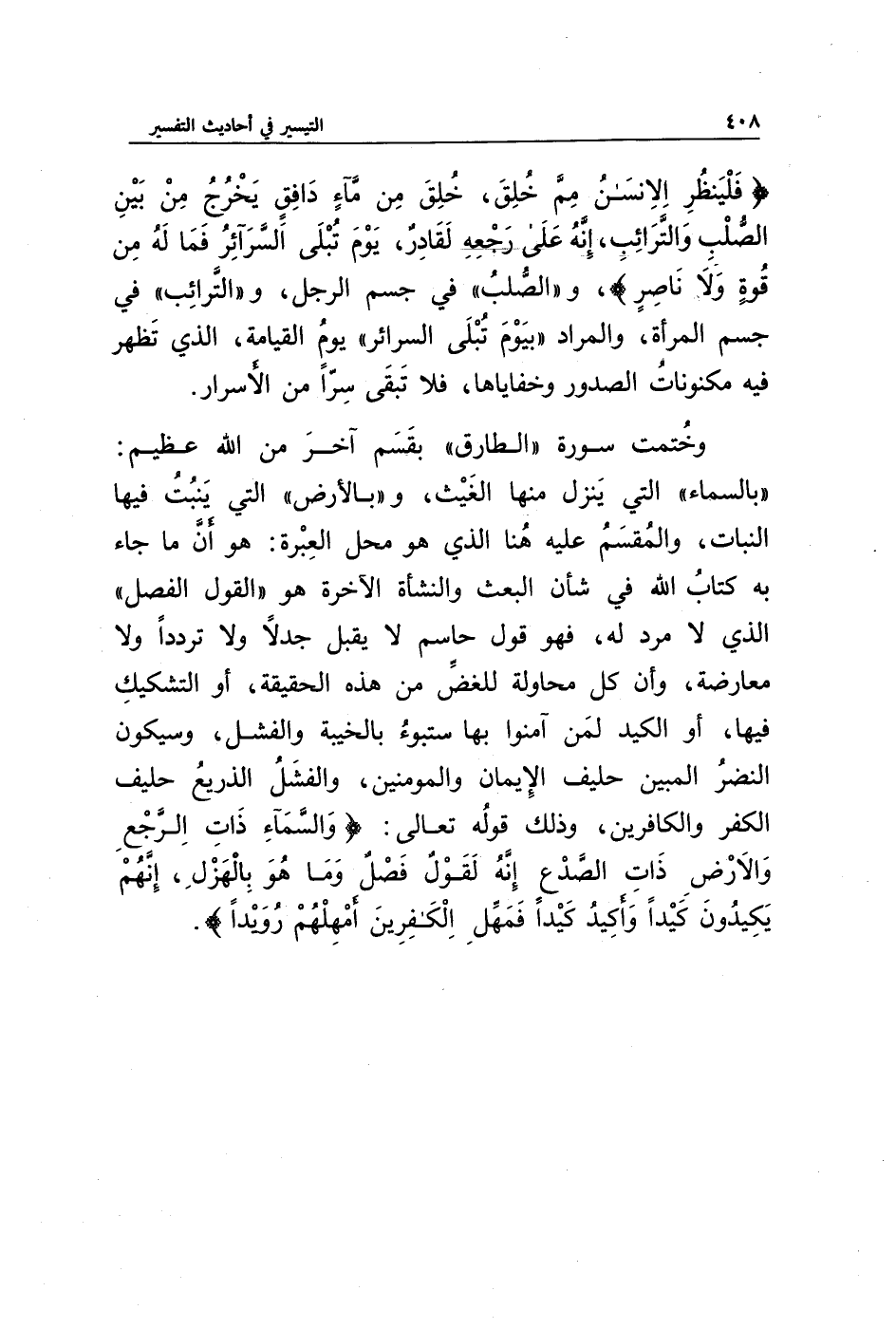 وخُتمت سورة " الطارق " بقسم آخر من الله عظيم: " بالسماء " التي ينزل منها الغيث، و " بالأرض " التي ينبت فيها النبات، والمقسم عليه هنا الذي هو محل العبرة: هو أن ما جاء به كتاب الله في شأن البعث والنشأة الآخرة هو " القول الفصل " الذي لا مرد له، فهو قول حاسم لا يقبل جدلا ولا ترددا ولا معارضة، وأن كل محاولة للغض من هذه الحقيقة، أو التشكيك فيها، أو الكيد لمن آمنوا بها ستبوء بالخيبة والفشل، وسيكون النصر المبين حليف الإيمان والمؤمنين، والفشل الذريع حليف الكفر والكافرين، وذلك قوله تعالى: {وَالسَّمَاءِ ذَاتِ الرَّجْعِ * وَالْأَرْضِ ذَاتِ الصَّدْعِ * إِنَّهُ لَقَوْلٌ فَصْلٌ * وَمَا هُوَ بِالْهَزْلِ * إِنَّهُمْ يَكِيدُونَ كَيْدًا * وَأَكِيدُ كَيْدًا * فَمَهِّلِ الْكَافِرِينَ أَمْهِلْهُمْ رُوَيْدًا}.