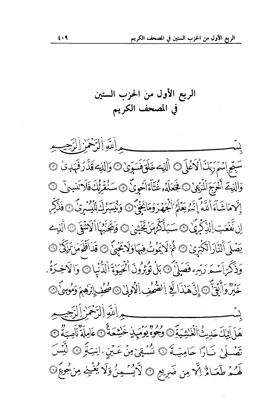 سَبِّحِ اسْمَ رَبِّكَ الْأَعْلَى (1) الَّذِي خَلَقَ فَسَوَّى (2) وَالَّذِي قَدَّرَ فَهَدَى (3) وَالَّذِي أَخْرَجَ الْمَرْعَى (4) فَجَعَلَهُ غُثَاءً أَحْوَى (5) سَنُقْرِئُكَ فَلَا تَنْسَى (6) إِلَّا مَا شَاءَ اللَّهُ إِنَّهُ يَعْلَمُ الْجَهْرَ وَمَا يَخْفَى (7) وَنُيَسِّرُكَ لِلْيُسْرَى (8) فَذَكِّرْ إِنْ نَفَعَتِ الذِّكْرَى (9) سَيَذَّكَّرُ مَنْ يَخْشَى (10) وَيَتَجَنَّبُهَا الْأَشْقَى (11) الَّذِي يَصْلَى النَّارَ الْكُبْرَى (12) ثُمَّ لَا يَمُوتُ فِيهَا وَلَا يَحْيَى (13) قَدْ أَفْلَحَ مَنْ تَزَكَّى (14) وَذَكَرَ اسْمَ رَبِّهِ فَصَلَّى (15) بَلْ تُؤْثِرُونَ الْحَيَاةَ الدُّنْيَا (16) وَالْآخِرَةُ خَيْرٌ وَأَبْقَى (17) إِنَّ هَذَا لَفِي الصُّحُفِ الْأُولَى (18) صُحُفِ إِبْرَاهِيمَ وَمُوسَى (19)