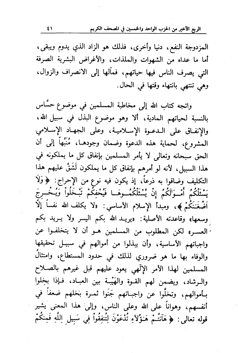 واتجه كتاب الله إلى مخاطبة المسلمين في موضوع حساس بالنسبة لحياتهم المادية، ألا وهو موضوع البذل في سبيل الله، والإنفاق على الدعوة الإسلامية، وعلى الجهاد الإسلامي المشروع، لحماية هذه الدعوة وضمان وجودها، منبها إلى أن الحق سبحانه وتعالى لا يأمر المسلمين بإنفاق كل ما يملكونه في هذا السبيل، لأنه لو أمرهم بإنفاق كل ما يملكون لشق عليهم هذا التكليف وضاقوا به ذرعا، إذ يكون فيه نوع من الإحراج: {وَلَا يَسْأَلْكُمْ أَمْوَالَكُمْ * إِنْ يَسْأَلْكُمُوهَا فَيُحْفِكُمْ تَبْخَلُوا وَيُخْرِجْ أَضْغَانَكُمْ}، ومبدأ الإسلام الأساسي: " لا يكلف الله نفسا إلا وسعها " وقاعدته الأصلية: " يريد الله بكم اليسر ولا يريد بكم العسر " لكن المطلوب من المسلمين هو أن لا يتخلفوا عن واجباتهم الأساسية، وأن يبذلوا من أموالهم في سبيل تحقيقها والوفاء بها ما هو ضروري لذلك في حدود المستطاع، وامتثال المسلمين لهذا الأمر الإلهي يعود عليهم قبل غيرهم بالصلاح والرشاد، ويضمن لهم القوة والهيبة بين العباد، فإذا بخلوا بأموالهم، وتخلوا عن واجباتهم جنوا ثمرة بخلهم ضعفا في أنفسهم، وهوانا على الله وعلى الناس، وإلى هذا المعنى يشير قوله تعالى: {هَا أَنْتُمْ هَؤُلَاءِ تُدْعَوْنَ لِتُنْفِقُوا فِي سَبِيلِ اللَّهِ فَمِنْكُمْ