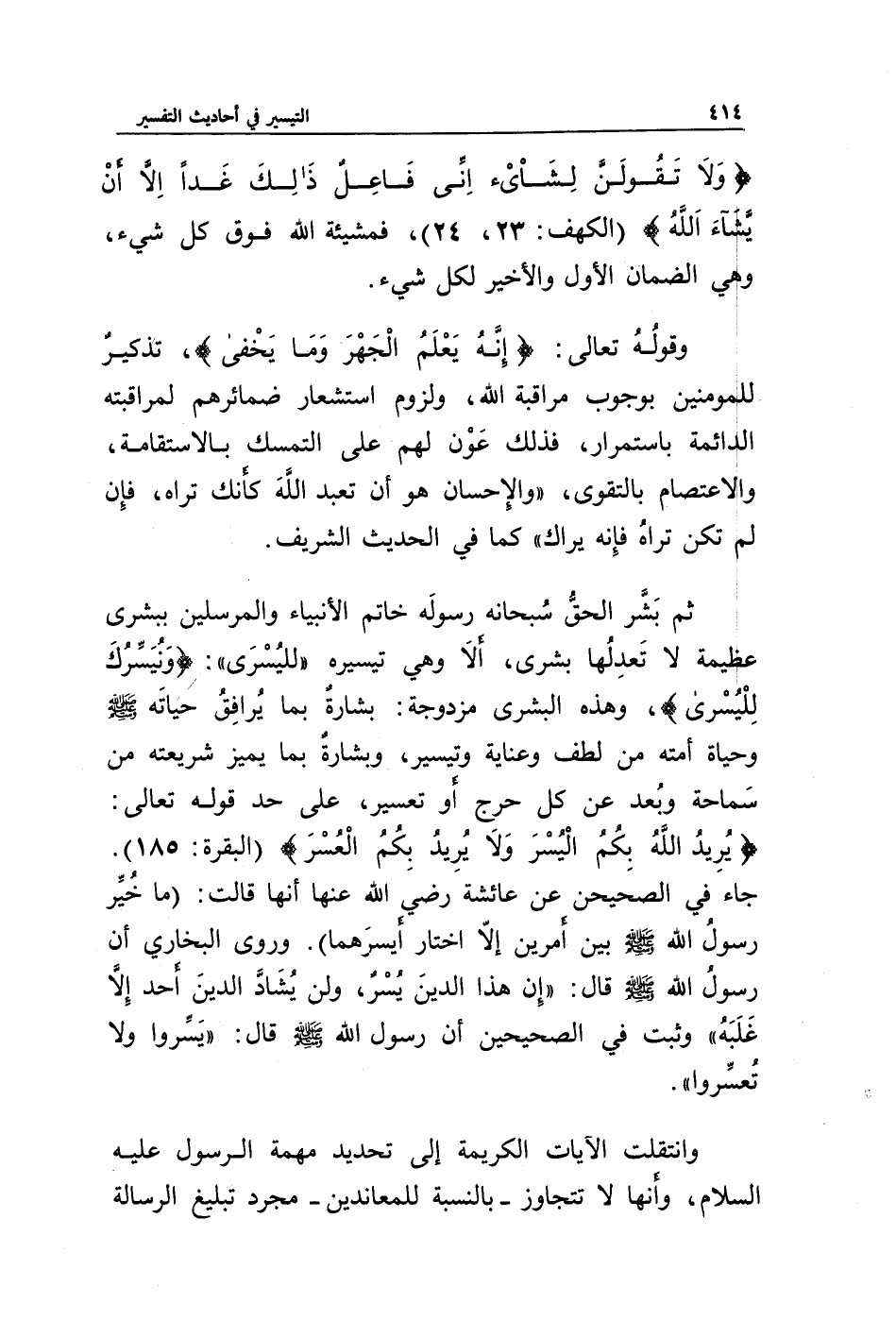 ثم بشر الحق سبحانه رسوله خاتم الأنبياء والمرسلين ببشرى عظيمة لا تعدلها بشرى، ألا وهي تيسيره " لليسرى ": {وَنُيَسِّرُكَ لِلْيُسْرَى}، وهذه البشرى مزدوجة، بشارة بما يرافق حياته صلى الله عليه وسلم وحياة أمته من لطف وعناية وتيسير، وبشارة بما يميز شريعته من سماحة وبعد عن كل حرج أو تعسير، على حد قوله تعالى: {يُرِيدُ اللَّهُ بِكُمُ الْيُسْرَ وَلَا يُرِيدُ بِكُمُ الْعُسْرَ} (البقرة: 185). جاء في الصحيحين عن عائشة رضي الله عنها أنها قالت: (ما خيّر رسول الله صلى الله عليه وسلم بين أمرين إلا اختار أيسرهما). وروى البخاري أن رسول الله صلى الله عليه وسلم قال: " إن هذا الدين يسر، ولن يشادّ الدين أحد إلا غلبه " وثبت في الصحيحين أن رسول الله صلى الله عليه وسلم قال: " يسّروا ولا تعسّروا ".