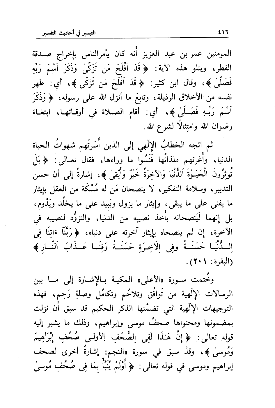 المؤمنين عمر بن عبد العزيز أنه كان يأمر الناس بإخراج صدقة الفطر، ويتلو هذه الآية: {قَدْ أَفْلَحَ مَنْ تَزَكَّى * وَذَكَرَ اسْمَ رَبِّهِ فَصَلَّى}، وقال ابن كثير: {قَدْ أَفْلَحَ مَنْ تَزَكَّى}، أي: طهر نفسه من الأخلاق الرذيلة، وتابع ما أنزل الله على رسوله، {وَذَكَرَ اسْمَ رَبِّهِ فَصَلَّى}، أي: أقام الصلاة في أوقاتها، ابتغاء رضوان الله وامتثالا لشرع الله.