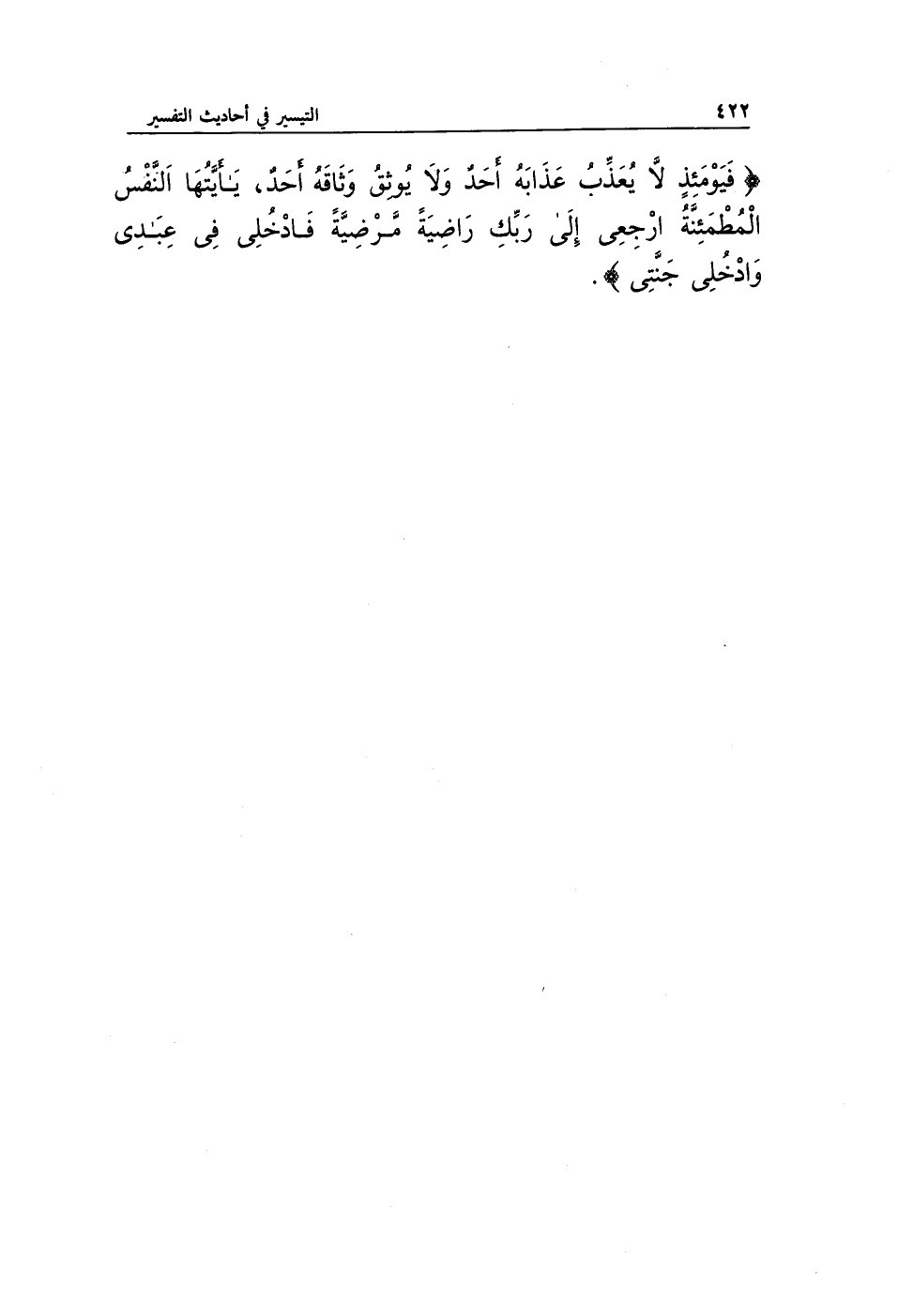 {فَيَوْمَئِذٍ لَا يُعَذِّبُ عَذَابَهُ أَحَدٌ * وَلَا يُوثِقُ وَثَاقَهُ أَحَدٌ * يَا أَيَّتُهَا النَّفْسُ الْمُطْمَئِنَّةُ * ارْجِعِي إِلَى رَبِّكِ رَاضِيَةً مَرْضِيَّةً * فَادْخُلِي فِي عِبَادِي * وَادْخُلِي جَنَّتِي}.