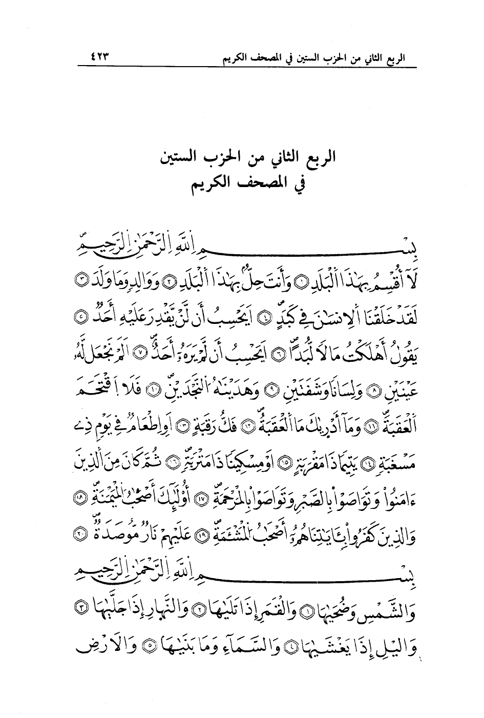 لَا أُقْسِمُ بِهَذَا الْبَلَدِ (1) وَأَنْتَ حِلٌّ بِهَذَا الْبَلَدِ (2) وَوَالِدٍ وَمَا وَلَدَ (3) لَقَدْ خَلَقْنَا الْإِنْسَانَ فِي كَبَدٍ (4) أَيَحْسَبُ أَنْ لَنْ يَقْدِرَ عَلَيْهِ أَحَدٌ (5) يَقُولُ أَهْلَكْتُ مَالًا لُبَدًا (6) أَيَحْسَبُ أَنْ لَمْ يَرَهُ أَحَدٌ (7) أَلَمْ نَجْعَلْ لَهُ عَيْنَيْنِ (8) وَلِسَانًا وَشَفَتَيْنِ (9) وَهَدَيْنَاهُ النَّجْدَيْنِ (10) فَلَا اقْتَحَمَ الْعَقَبَةَ (11) وَمَا أَدْرَاكَ مَا الْعَقَبَةُ (12) فَكُّ رَقَبَةٍ (13) أَوْ إِطْعَامٌ فِي يَوْمٍ ذِي مَسْغَبَةٍ (14) يَتِيمًا ذَا مَقْرَبَةٍ (15) أَوْ مِسْكِينًا ذَا مَتْرَبَةٍ (16) ثُمَّ كَانَ مِنَ الَّذِينَ آمَنُوا وَتَوَاصَوْا بِالصَّبْرِ وَتَوَاصَوْا بِالْمَرْحَمَةِ (17) أُولَئِكَ أَصْحَابُ الْمَيْمَنَةِ (18) وَالَّذِينَ كَفَرُوا بِآيَاتِنَا هُمْ أَصْحَابُ الْمَشْأَمَةِ (19) عَلَيْهِمْ نَارٌ مُؤْصَدَةٌ (20)