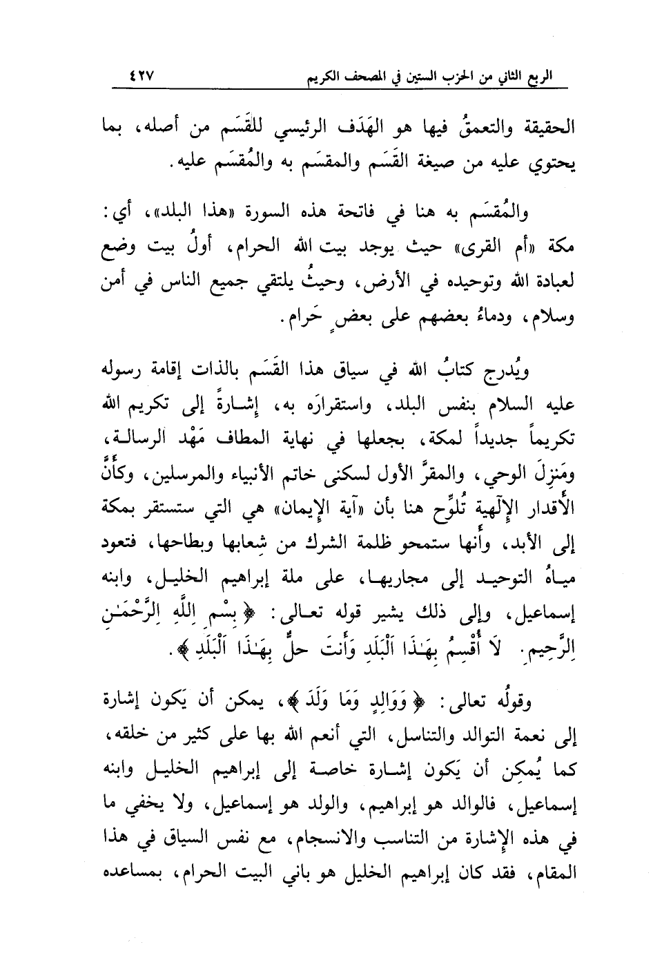 ويدرج كتاب الله في سياق هذا القسم بالذات إقامة رسوله عليه السلام بنفس البلد، واستقراره به، إشارة إلى تكريم الله تكريما جديدا لمكة، بجعلها في نهاية المطاف مهد الرسالة، ومنزل الوحي، والمقر الأول لسكنى خاتم الأنبياء والمرسلين، وكأن الأقدار الإلهية تلوح هنا بأن " آية الإيمان " هي التي ستستقر بمكة إلى الأبد، وأنها ستمحو ظلمة الشرك من شعابها وبطاحها، فتعود مياه التوحيد إلى مجاريها، على ملة إبراهيم الخليل، وابنه إسماعيل، وإلى ذلك يشير قوله تعالى: {بسم الله الرحمن الرحيم لَا أُقْسِمُ بِهَذَا الْبَلَدِ * وَأَنْتَ حِلٌّ بِهَذَا الْبَلَدِ}.