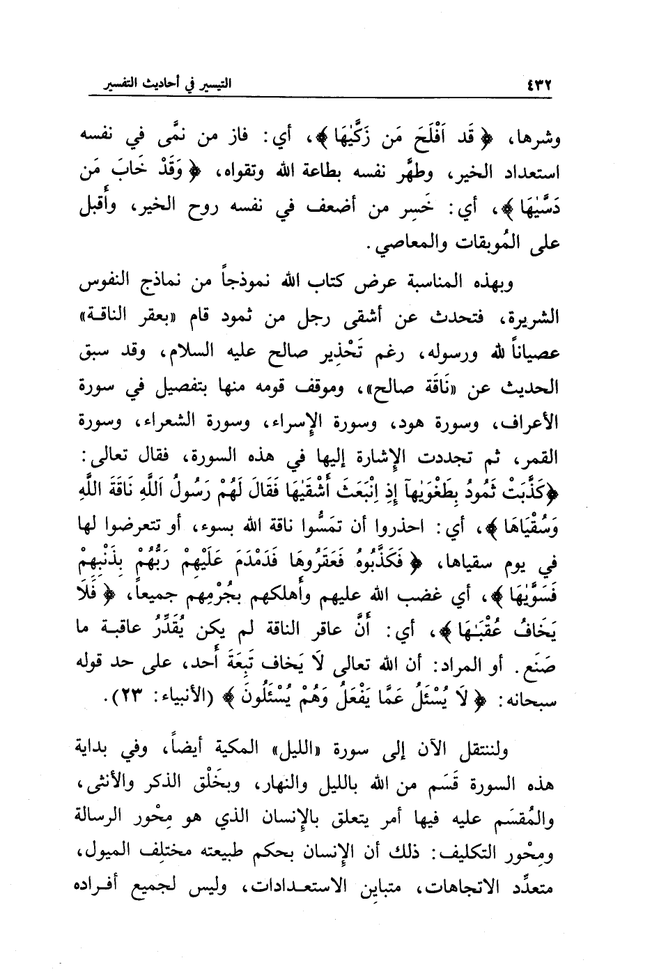وبهذه المناسبة عرض كتاب الله نموذجا من نماذج النفوس الشريرة، فتحدث عن أشقى رجل من ثمود قام " بعقر الناقة " عصيانا لله ورسوله، رغم تحذير صالح عليه السلام، وقد سبق الحديث عن " ناقة صالح "، وموقف قومه منها بتفصيل في سورة الأعراف، وسورة هود، وسورة الإسراء، وسورة الشعراء، وسورة القمر، ثم تجددت الإشارة إليها في هذه السورة، فقال تعالى: {كَذَّبَتْ ثَمُودُ بِطَغْوَاهَا * إِذِ انْبَعَثَ أَشْقَاهَا * فَقَالَ لَهُمْ رَسُولُ اللَّهِ نَاقَةَ اللَّهِ وَسُقْيَاهَا}، أي: احذروا أن تمسوا ناقة الله بسوء، أو تتعرضوا لها في يوم سقياها، {فَكَذَّبُوهُ فَعَقَرُوهَا فَدَمْدَمَ عَلَيْهِمْ رَبُّهُمْ بِذَنْبِهِمْ فَسَوَّاهَا}، أي غضب الله عليهم وأهلكهم بجرمهم جميعا، {وَلَا يَخَافُ عُقْبَاهَا}، أي: أن عاقر الناقة لم يكن يقدر عاقبة ما صنع، أو المراد: أن الله تعالى لا يخاف تبعة أحد، على حد قوله سبحانه: {لَا يُسْأَلُ عَمَّا يَفْعَلُ وَهُمْ يُسْأَلُونَ} (الأنبياء: 23).