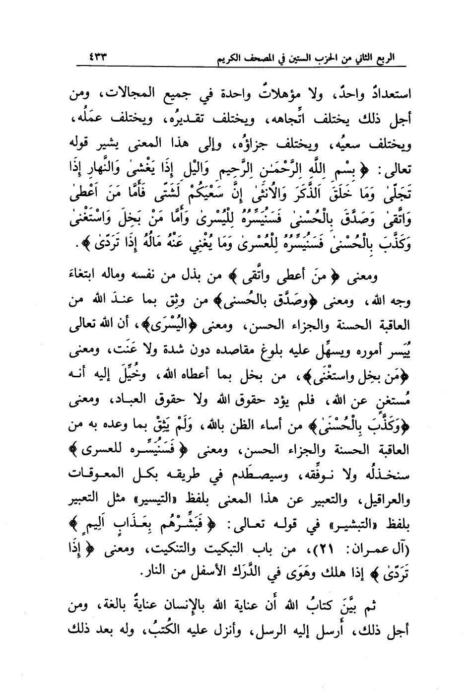 ومعنى {مَنْ أَعْطَى وَاتَّقَى} من بذل من نفسه وماله ابتغاء وجه الله، ومعنى {وَصَدَّقَ بِالْحُسْنَى} من وثق بما عند الله من العاقبة الحسنة والجزاء الحسن، ومعنى {اليُسْرَى}، أن الله تعالى ييسر أموره ويسهل عليه بلوغ مقاصده دون شدة ولا عنت، ومعنى {مَنْ بَخِلَ وَاسْتَغْنَى} من بخل بما أعطاه الله، وخيل إليه أنه مستغن عن الله، فلم يؤد حقوق الله ولا حقوق العباد، ومعنى {وَكَذَّبَ بِالْحُسْنَى} من أساء الظن بالله، ولم يثق بما وعده به من العاقبة الحسنة والجزاء الحسن، ومعنى {فَسَنُيَسِّرُهُ لِلْعُسْرَى} سنخذله ولا نوفقه، وسيصطدم في طريقه بكل المعوقات والعراقيل، والتعبير عن هذا المعنى بلفظ " التيسير " مثل التعبير بلفظ " التبشير " في قوله تعالى: {فَبَشِّرْهُمْ بِعَذَابٍ أَلِيمٍ} (آل عمران: 21)، من باب التبكيت والتنكيت، ومعنى {إِذَا تَرَدَّى} إذا هلك وهوى في الدرك الأسفل من النار.