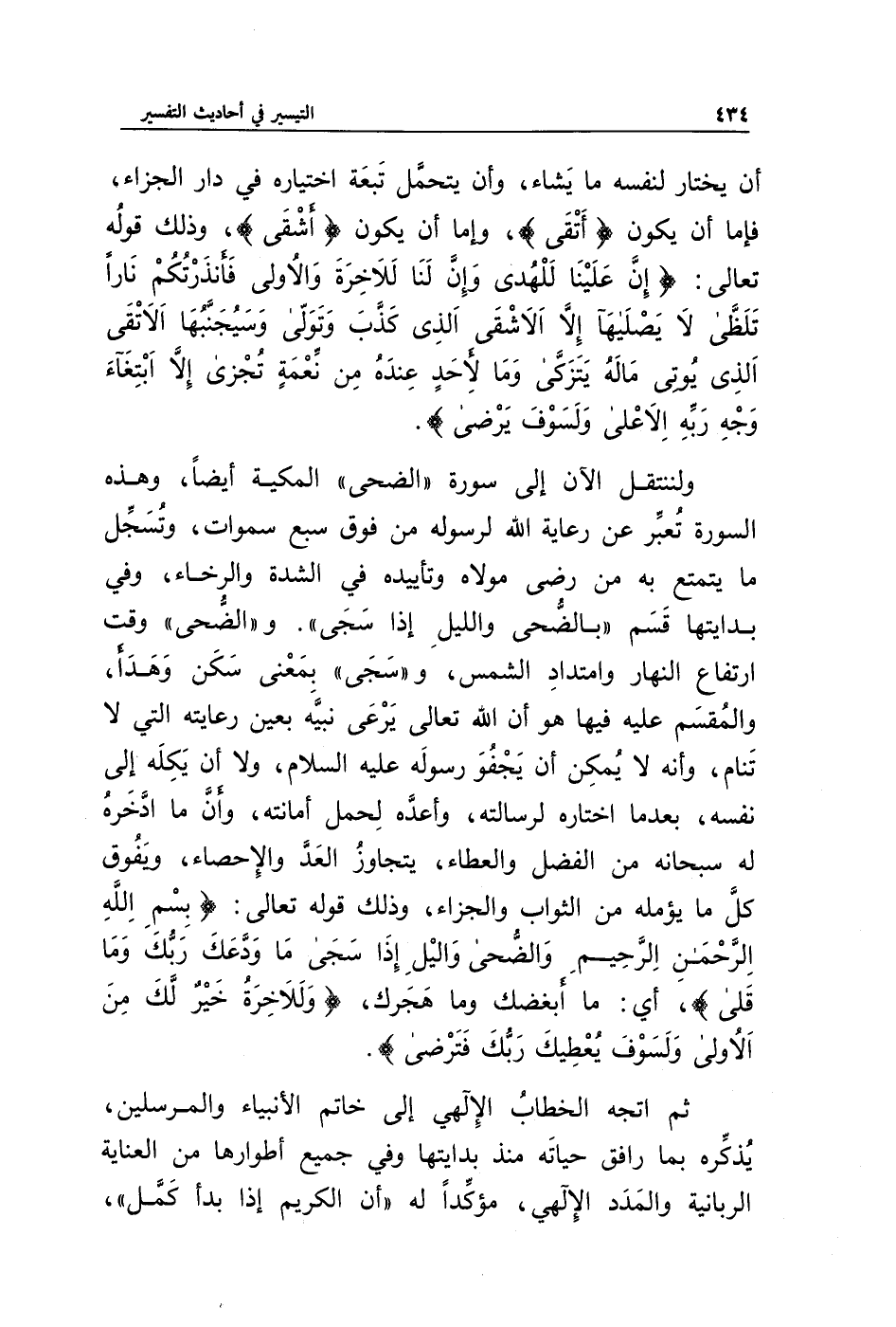ولننتقل الآن إلى سورة " الضحى " المكية أيضا، وهذه السورة تعبر عن رعاية الله لرسوله من فوق سبع سماوات، وتسجل ما يتمتع به من رضى مولاه وتأييده في الشدة والرخاء، وفي بدايتها قسم " بالضحى والليل إذا سجى ". و {الضحى1} وقت ارتفاع النهار وامتداد الشمس، و " سجى " بمعنى سكن وهدأ، والمقسم عليه فيها هو أن الله تعالى يرعى نبيه بعين رعايته التي لا تنام، وأنه لا يمكن أن يجفو رسوله عليه السلام، ولا أن يكله إلى نفسه، بعدما اختاره لرسالته، وأعده لحمل أمانته، وأن ما ادخره له سبحانه من الفضل والعطاء، يتجاوز العد والإحصاء، ويفوق كل ما يؤمله من الثواب والجزاء، وذلك قوله تعالى: {بسم الله الرحمن الرحيم