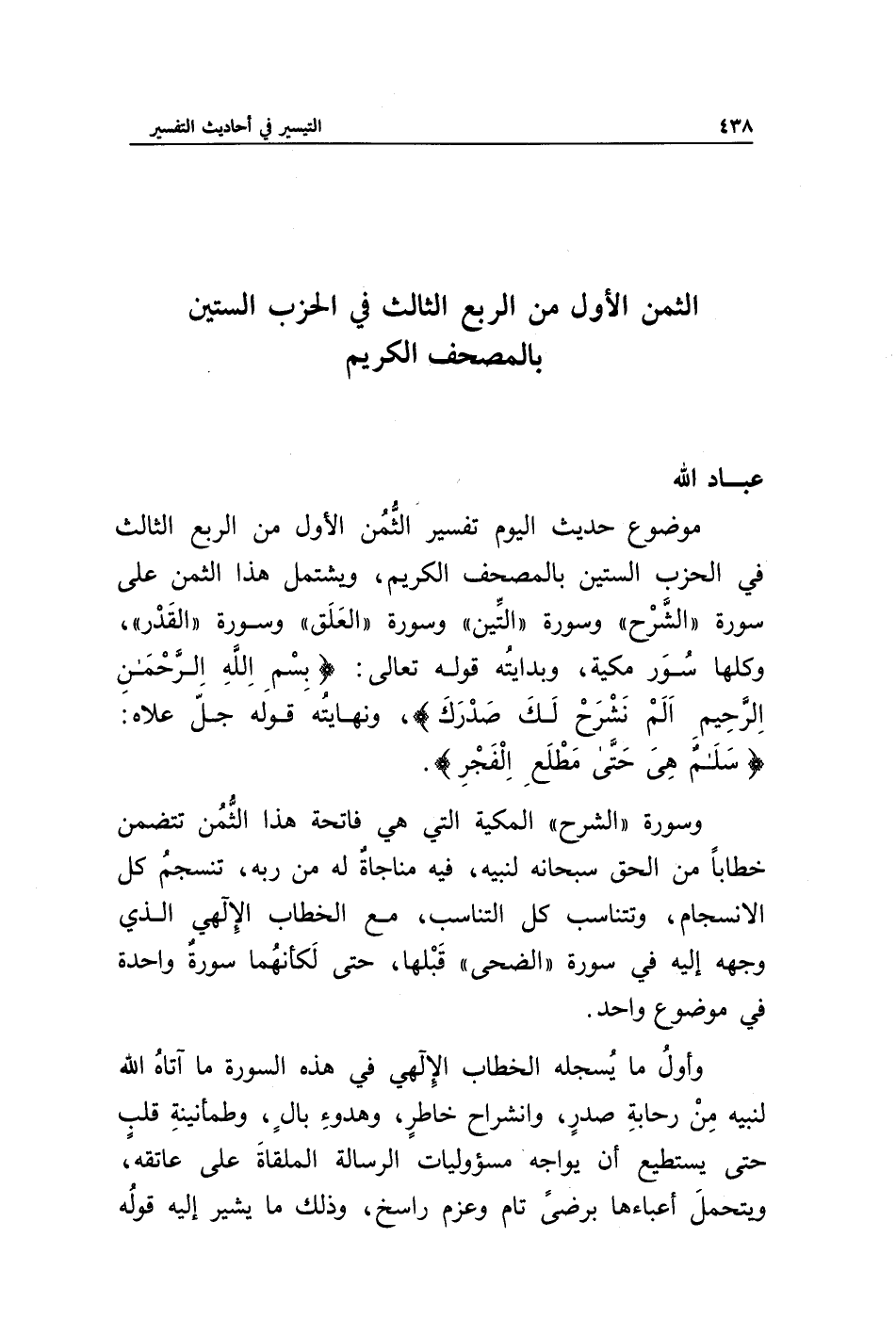 موضوع حديث اليوم تفسير الثمن الأول من الربع الثالث فى الحزب الستين بالمصحف الكريم، ويشتمل هذا الثمن على سورة "الشرح" وسورة "التين" وسورة "العلق" وسورة "القدر"، وكلها سور مكية، وبدايته قوله تعالى: {بسم الله الرحمن الرحيم أَلَمْ نَشْرَحْ لَكَ صَدْرَكَ}، ونهايته قوله جل علاه: {سَلَامٌ هِيَ حَتَّى مَطْلَعِ الْفَجْرِ}