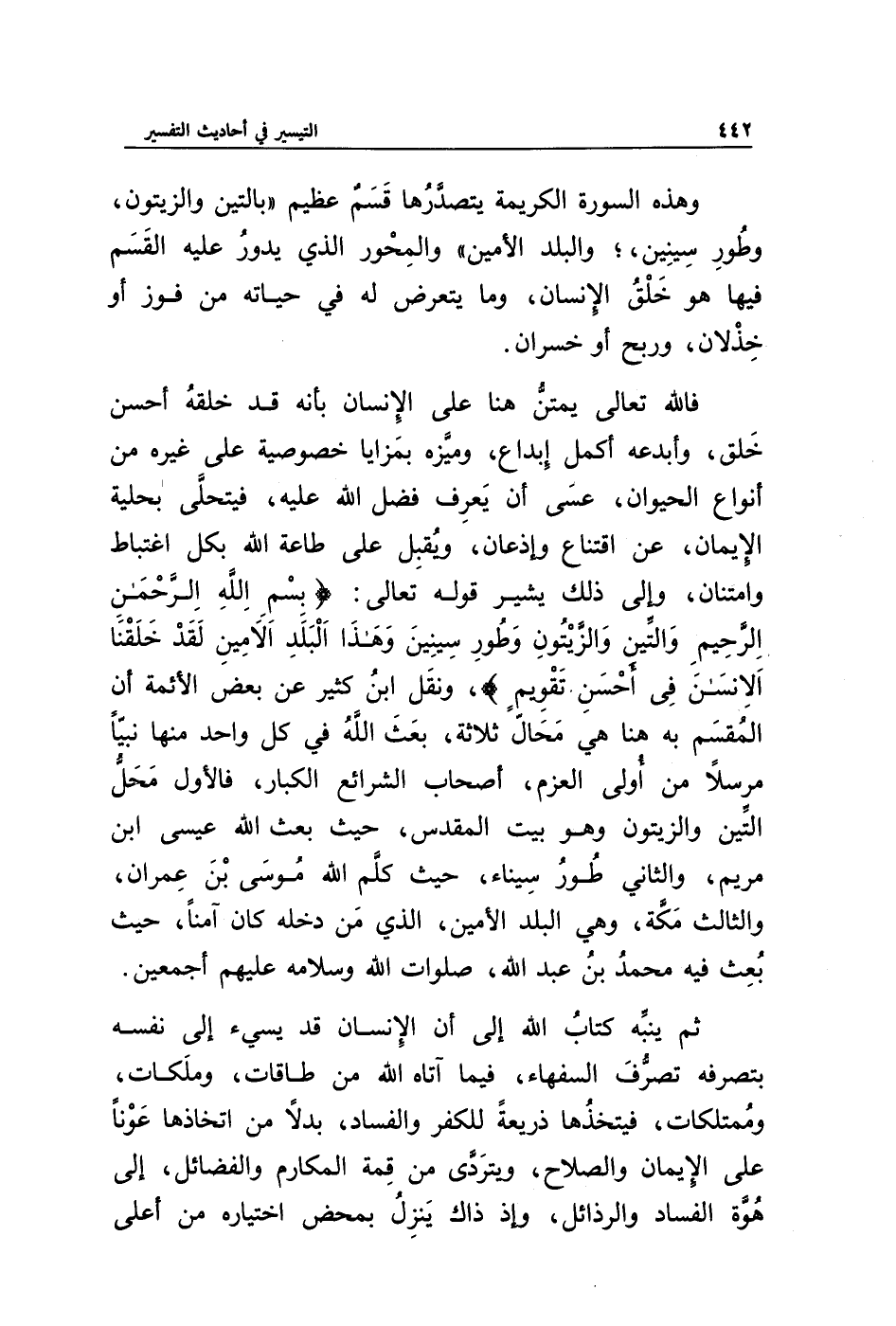 فالله تعالى يمتن هنا على الإنسان بأنه قد خلقه أحسن خلق، وأبدعه أكمل إبداع، وميزه بمزايا خصوصية على غيره من أنواع الحيوان، عسى أن يعرف فضل الله عليه، فيتحلى بحلية الإيمان، عن اقتناع وإذعان، ويقبل على طاعة الله بكل اغتباط وامتنان، وإلى ذلك يشير قوله تعالى: {بسم الله الرحمن الرحيم وَالتِّينِ وَالزَّيْتُونِ * وَطُورِ سِينِينَ * وَهَذَا الْبَلَدِ الْأَمِينِ * لَقَدْ خَلَقْنَا الْإِنْسَانَ فِي أَحْسَنِ تَقْوِيمٍ}، ونقل ابن كثير عن بعض الأئمة أن المقسم به هنا هي محال ثلاثة، بعث الله في كل واحد منها نبيا مرسلا من أولى العزم، أصحاب الشرائع الكبار، فالأول محل التين والزيتون وهو بيت المقدس، حيث بعث الله عيسى ابن مريم، والثاني طور سيناء، حيث كلم الله موسى بن عمران، والثالث مكة، وهي البلد الأمين، الذي من دخله كان آمنا، حيث بعث فيه محمد بن عبد الله، صلوات الله وسلامه عليهم أجمعين.