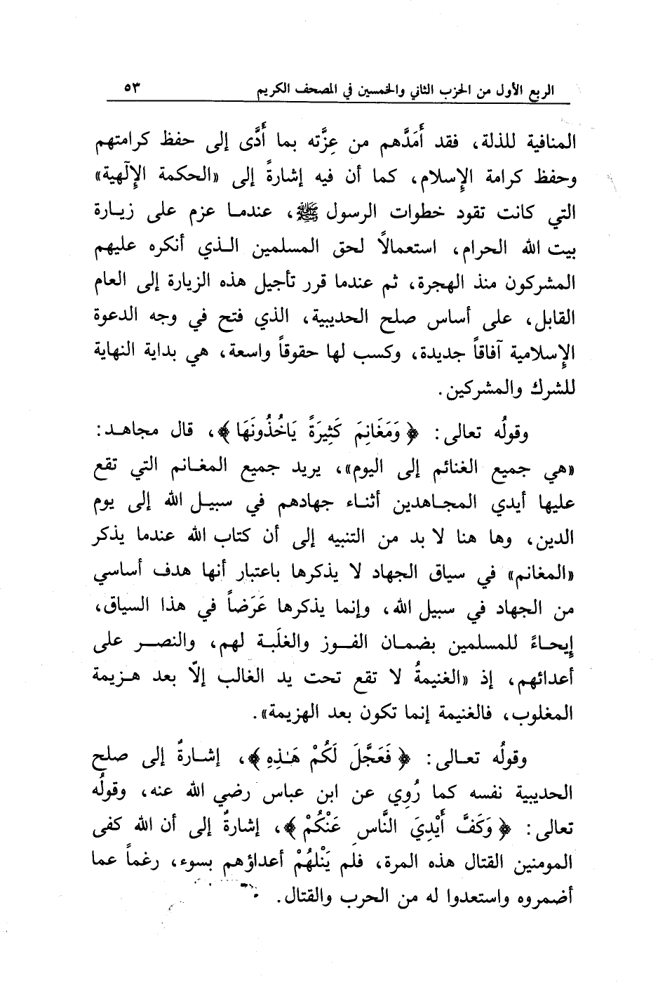 المنافية للذلة، فقد أمدهم من عزته بما أدى إلى حفظ كرامتهم وحفظ كرامة الإسلام، كما أن فيه إشارة إلى " الحكمة الإلهية " التي كانت تقود خطوات الرسول صلى الله عليه وسلم عندما عزم على زيارة بيت الله الحرام، استعمالا لحق المسلمين الذي أنكره عليهم المشركون منذ الهجرة، ثم عندما قرر تأجيل هذه الزيارة إلى العام القابل، على أساس صلح الحديبية الذي فتح في وجه الدعوة الإسلامية آفاقا جديدة، وكسب لها حقوقا واسعة، هي بداية النهاية للشرك والمشركين.