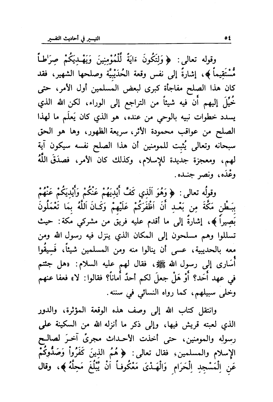 وقوله تعالى: {وَلِتَكُونَ آيَةً لِلْمُؤْمِنِينَ وَيَهْدِيَكُمْ صِرَاطًا مُسْتَقِيمًا} إشارة إلى نفس وقعة الحديبية وصلحها الشهير، فقد كان هذا الصلح مفاجأة كبرى لبعض المسلمين أول الأمر، حتى خيل إليهم أن فيه شيئا من التراجع إلى الوراء، لكن الله الذي يسدد خطوات نبيه بالوحي من عنده، هو الذي كان يعلم ما لهذا الصلح من عواقب محمودة الأثر، سريعة الظهور، وها هو الحق سبحانه وتعالى يثبت للمؤمنين أن هذا الصلح نفسه سيكون آية لهم، ومعجزة جديدة للإسلام، وكذلك كان الأمر، فصدق الله وعده، ونصر جنده.