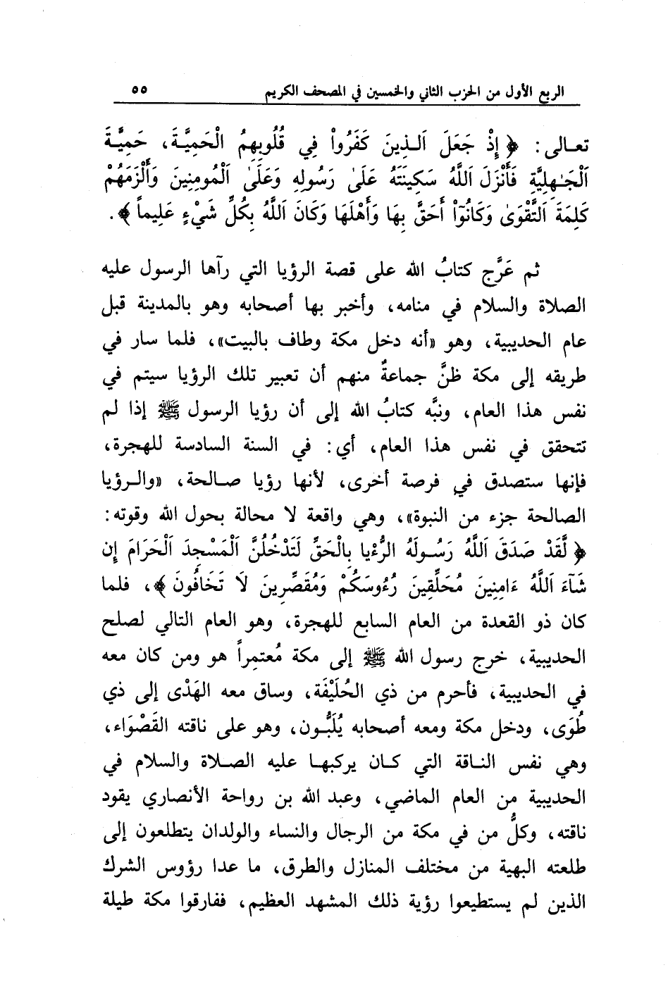 ثم عرج كتاب الله على قصة الرؤيا التي رآها الرسول عليه الصلاة والسلام في منانه، وأخبر بها أصحابه وهو بالمدينة قبل عام الحديبية، وهو " أنه دخل مكة وطاف بالبيت "، فلما سار في طريقه إلى مكة ظن جماعة منهم أن تعبير تلك الرؤيا سيتم في نفس العام، ونبه كتاب الله إلى أن رؤيا رسول الله صلى الله عليه وسلم إذا لم تتحقق في نفس هذا العام، أي: في السنة السادسة للهجرة، فإنها ستصدق في فرصة أخرى، لأنها رؤيا صالحة، " والرؤيا الصالحة جزء من النبوة "، وهي واقعة لا محالة بحول الله وقوته: {لَقَدْ صَدَقَ اللَّهُ رَسُولَهُ الرُّؤْيَا بِالْحَقِّ لَتَدْخُلُنَّ الْمَسْجِدَ الْحَرَامَ إِنْ شَاءَ اللَّهُ آمِنِينَ مُحَلِّقِينَ رُءُوسَكُمْ وَمُقَصِّرِينَ لَا تَخَافُونَ}، فلما كان ذو القعدة من العام السابع للهجرة، وهو العام التالي لصلح الحديبية، خرج رسول الله صلى الله عليه وسلم إلى مكة معتمرا هو ومن كان معه في الحديبية، فأحرم من ذي الحليفة، وساق معه الهدي إلى ذي طوى، ودخل مكة ومعه أصحابه يلبون، وهو على ناقته القصواء، وهي نفس الناقة التي كان يركبها عليه الصلاة والسلام في الحديبية من العام الماضي، وعبد الله بن رواحة الأنصاري يقود ناقته، وكل من في مكة من الرجال والنساء والولدان يتطلعون إلى طلعته البهية من مختلف المنازل والطرق، ما عدا رؤوس الشرك الذين لم يستطيعوا رؤية ذلك المشهد العظيم، ففارقوا مكة طيلة