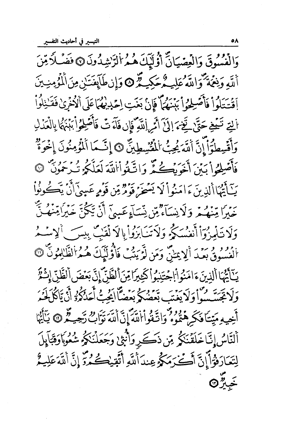 وَالْفُسُوقَ وَالْعِصْيَانَ أُولَئِكَ هُمُ الرَّاشِدُونَ (7) فَضْلًا مِنَ اللَّهِ وَنِعْمَةً وَاللَّهُ عَلِيمٌ حَكِيمٌ (8) وَإِنْ طَائِفَتَانِ مِنَ الْمُؤْمِنِينَ اقْتَتَلُوا فَأَصْلِحُوا بَيْنَهُمَا فَإِنْ بَغَتْ إِحْدَاهُمَا عَلَى الْأُخْرَى فَقَاتِلُوا الَّتِي تَبْغِي حَتَّى تَفِيءَ إِلَى أَمْرِ اللَّهِ فَإِنْ فَاءَتْ فَأَصْلِحُوا بَيْنَهُمَا بِالْعَدْلِ وَأَقْسِطُوا إِنَّ اللَّهَ يُحِبُّ الْمُقْسِطِينَ (9) إِنَّمَا الْمُؤْمِنُونَ إِخْوَةٌ فَأَصْلِحُوا بَيْنَ أَخَوَيْكُمْ وَاتَّقُوا اللَّهَ لَعَلَّكُمْ تُرْحَمُونَ (10) يَا أَيُّهَا الَّذِينَ آمَنُوا لَا يَسْخَرْ قَوْمٌ مِنْ قَوْمٍ عَسَى أَنْ يَكُونُوا خَيْرًا مِنْهُمْ وَلَا نِسَاءٌ مِنْ نِسَاءٍ عَسَى أَنْ يَكُنَّ خَيْرًا مِنْهُنَّ وَلَا تَلْمِزُوا أَنْفُسَكُمْ وَلَا تَنَابَزُوا بِالْأَلْقَابِ بِئْسَ الِاسْمُ الْفُسُوقُ بَعْدَ الْإِيمَانِ وَمَنْ لَمْ يَتُبْ فَأُولَئِكَ هُمُ الظَّالِمُونَ (11) يَا أَيُّهَا الَّذِينَ آمَنُوا اجْتَنِبُوا كَثِيرًا مِنَ الظَّنِّ إِنَّ بَعْضَ الظَّنِّ إِثْمٌ وَلَا تَجَسَّسُوا وَلَا يَغْتَبْ بَعْضُكُمْ بَعْضًا أَيُحِبُّ أَحَدُكُمْ أَنْ يَأْكُلَ لَحْمَ أَخِيهِ مَيْتًا فَكَرِهْتُمُوهُ وَاتَّقُوا اللَّهَ إِنَّ اللَّهَ تَوَّابٌ رَحِيمٌ (12) يَا أَيُّهَا النَّاسُ إِنَّا خَلَقْنَاكُمْ مِنْ ذَكَرٍ وَأُنْثَى وَجَعَلْنَاكُمْ شُعُوبًا وَقَبَائِلَ لِتَعَارَفُوا إِنَّ أَكْرَمَكُمْ عِنْدَ اللَّهِ أَتْقَاكُمْ إِنَّ اللَّهَ عَلِيمٌ خَبِيرٌ (13)