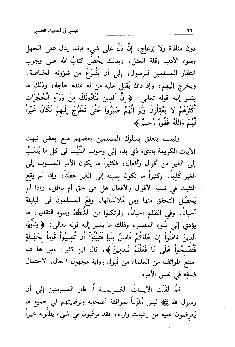 وفيما يتعلق بسلوك المسلمين بعضهم مع بعض نبهت الآيات الكريمة بادئ ذي بدء إلى وجوب التثبت في كل ما ينسب إلى الغير من أقوال وأفعال، فكثيرا ما يكون الأمر المنسوب إلى الغير كذبا، وكثيرا ما تكون نسبته إلى الغير خطئا، وإذا لم يقع التثبت في نسبة الأقوال والأفعال هل هي حق أم باطل، وإذا لم يحصل التحقق منها ومن ملابساتها، وقع المسلمون في البلبلة أحيانا، وفي الظلم أحيانا، وارتكبوا من الشطط وسوء التقدير، ما يؤدي إلى سوء المصير، وذلك ما يشير إليه قوله تعالى: {يَا أَيُّهَا الَّذِينَ آمَنُوا إِنْ جَاءَكُمْ فَاسِقٌ بِنَبَإٍ فَتَبَيَّنُوا أَنْ تُصِيبُوا قَوْمًا بِجَهَالَةٍ فَتُصْبِحُوا عَلَى مَا فَعَلْتُمْ نَادِمِينَ}، قال ابن كثير: " من ها هنا امتنع طوائف من العلماء من قبول رواية مجهول الحال، لاحتمال فسقه في نفس الأمر ".