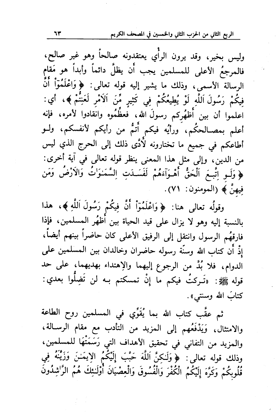 وليس بخير، وقد يرون الرأي يعتقدونه صالحا وهو غير صالح، فالمرجع الأعلى للمسلمين يجب أن يظل دائما وأبدا هو مقام الرسالة الأسمى، وذلك ما يشير إليه قوله: {وَاعْلَمُوا أَنَّ فِيكُمْ رَسُولَ اللَّهِ لَوْ يُطِيعُكُمْ فِي كَثِيرٍ مِنَ الْأَمْرِ لَعَنِتُّمْ}، أي: اعلموا أن بين أظهركم رسول الله، فعظموه وانقادوا لأمره، فإنه أعلم بمصالحكم، ورأيه فيكم أتم من رأيكم لأنفسكم، ولو أطاعكم في جميع ما تختارونه لأدى ذلك إلى الحرج الذي ليس من الدين، وإلى مثل هذا المعنى ينظر قوله تعالى في آية أخرى: {وَلَوِ اتَّبَعَ الْحَقُّ أَهْوَاءَهُمْ لَفَسَدَتِ السَّمَاوَاتُ وَالْأَرْضُ وَمَنْ فِيهِنَّ} (المؤمنون: 71).