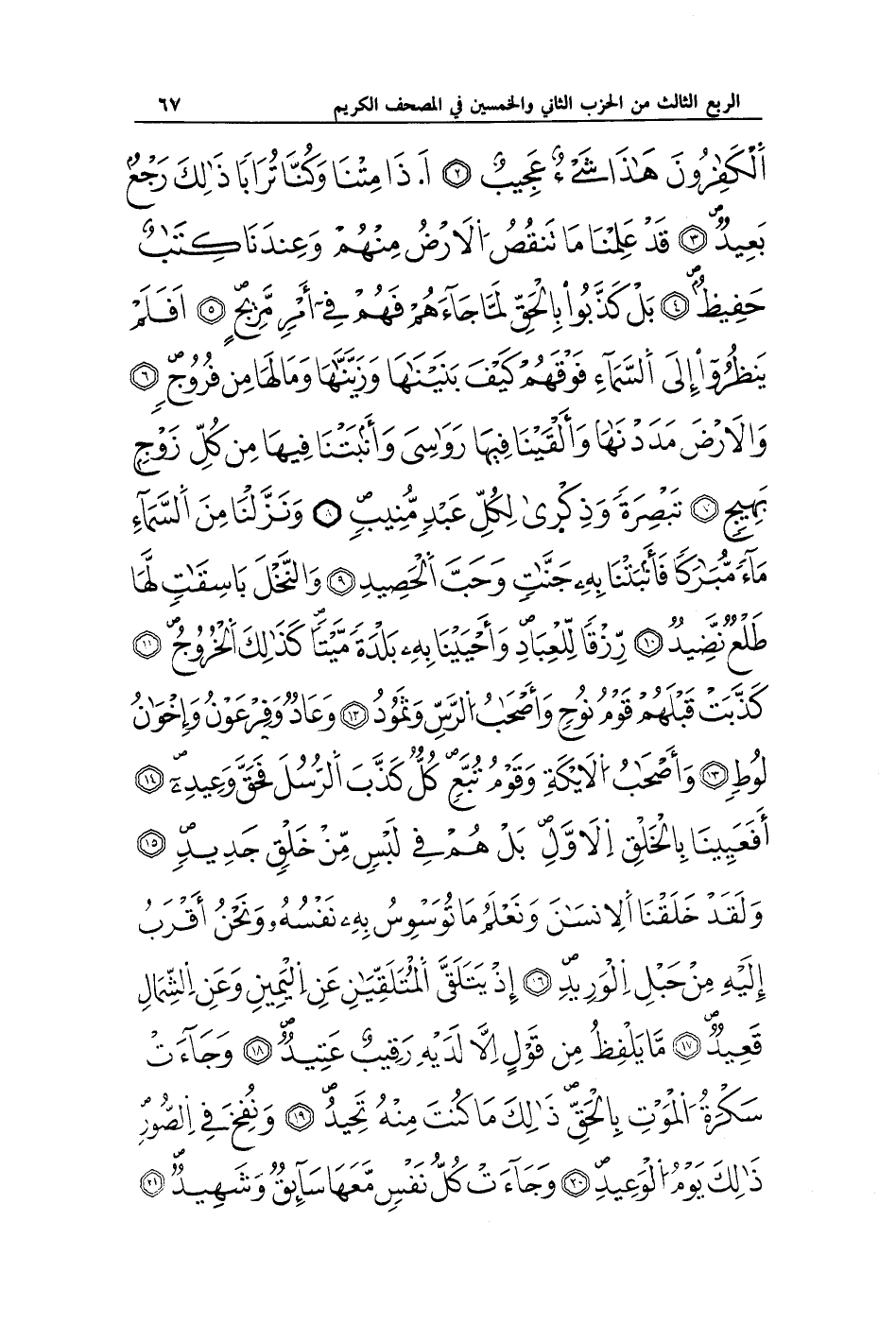 الْكَافِرُونَ هَذَا شَيْءٌ عَجِيبٌ (2) أَإِذَا مِتْنَا وَكُنَّا تُرَابًا ذَلِكَ رَجْعٌ بَعِيدٌ (3) قَدْ عَلِمْنَا مَا تَنْقُصُ الْأَرْضُ مِنْهُمْ وَعِنْدَنَا كِتَابٌ حَفِيظٌ (4) بَلْ كَذَّبُوا بِالْحَقِّ لَمَّا جَاءَهُمْ فَهُمْ فِي أَمْرٍ مَرِيجٍ (5) أَفَلَمْ يَنْظُرُوا إِلَى السَّمَاءِ فَوْقَهُمْ كَيْفَ بَنَيْنَاهَا وَزَيَّنَّاهَا وَمَا لَهَا مِنْ فُرُوجٍ (6) وَالْأَرْضَ مَدَدْنَاهَا وَأَلْقَيْنَا فِيهَا رَوَاسِيَ وَأَنْبَتْنَا فِيهَا مِنْ كُلِّ زَوْجٍ بَهِيجٍ (7) تَبْصِرَةً وَذِكْرَى لِكُلِّ عَبْدٍ مُنِيبٍ (8) وَنَزَّلْنَا مِنَ السَّمَاءِ مَاءً مُبَارَكًا فَأَنْبَتْنَا بِهِ جَنَّاتٍ وَحَبَّ الْحَصِيدِ (9) وَالنَّخْلَ بَاسِقَاتٍ لَهَا طَلْعٌ نَضِيدٌ (10) رِزْقًا لِلْعِبَادِ وَأَحْيَيْنَا بِهِ بَلْدَةً مَيْتًا كَذَلِكَ الْخُرُوجُ (11) كَذَّبَتْ قَبْلَهُمْ قَوْمُ نُوحٍ وَأَصْحَابُ الرَّسِّ وَثَمُودُ (12) وَعَادٌ وَفِرْعَوْنُ وَإِخْوَانُ لُوطٍ (13) وَأَصْحَابُ الْأَيْكَةِ وَقَوْمُ تُبَّعٍ كُلٌّ كَذَّبَ الرُّسُلَ فَحَقَّ وَعِيدِ (14) أَفَعَيِينَا بِالْخَلْقِ الْأَوَّلِ بَلْ هُمْ فِي لَبْسٍ مِنْ خَلْقٍ جَدِيدٍ (15) وَلَقَدْ خَلَقْنَا الْإِنْسَانَ وَنَعْلَمُ مَا تُوَسْوِسُ بِهِ نَفْسُهُ وَنَحْنُ أَقْرَبُ إِلَيْهِ مِنْ حَبْلِ الْوَرِيدِ (16) إِذْ يَتَلَقَّى الْمُتَلَقِّيَانِ عَنِ الْيَمِينِ وَعَنِ الشِّمَالِ قَعِيدٌ (17) مَا يَلْفِظُ مِنْ قَوْلٍ إِلَّا لَدَيْهِ رَقِيبٌ عَتِيدٌ (18) وَجَاءَتْ سَكْرَةُ الْمَوْتِ بِالْحَقِّ ذَلِكَ مَا كُنْتَ مِنْهُ تَحِيدُ (19) وَنُفِخَ فِي الصُّورِ ذَلِكَ يَوْمُ الْوَعِيدِ (20) وَجَاءَتْ كُلُّ نَفْسٍ مَعَهَا سَائِقٌ وَشَهِيدٌ (21)