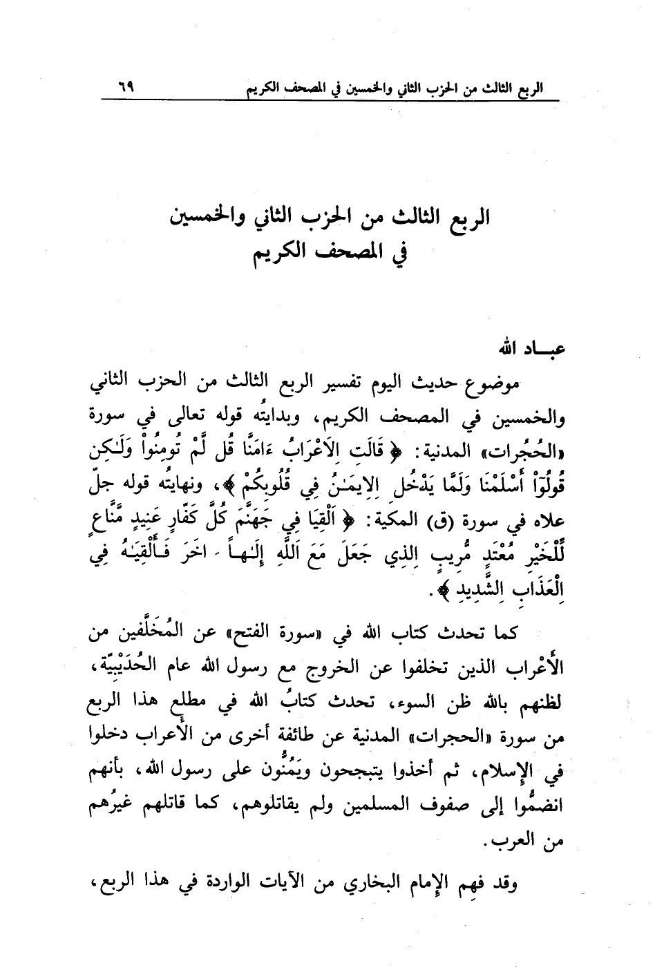 موضوع حديث اليوم تفسير الربع الثالث من الحزب الثاني والخمسين في المصحف الكريم، وبدايته قوله تعالى في سورة "الحجرات" المدنية: {قَالَتِ الْأَعْرَابُ آمَنَّا قُلْ لَمْ تُؤْمِنُوا وَلَكِنْ قُولُوا أَسْلَمْنَا وَلَمَّا يَدْخُلِ الْإِيمَانُ فِي قُلُوبِكُمْ}، ونهايته قوله جل علاه في سورة "ق" المكية: {أَلْقِيَا فِي جَهَنَّمَ كُلَّ كَفَّارٍ عَنِيدٍ * مَنَّاعٍ لِلْخَيْرِ مُعْتَدٍ مُرِيبٍ * الَّذِي جَعَلَ مَعَ اللَّهِ إِلَهًا آخَرَ فَأَلْقِيَاهُ فِي الْعَذَابِ الشَّدِيدِ}.