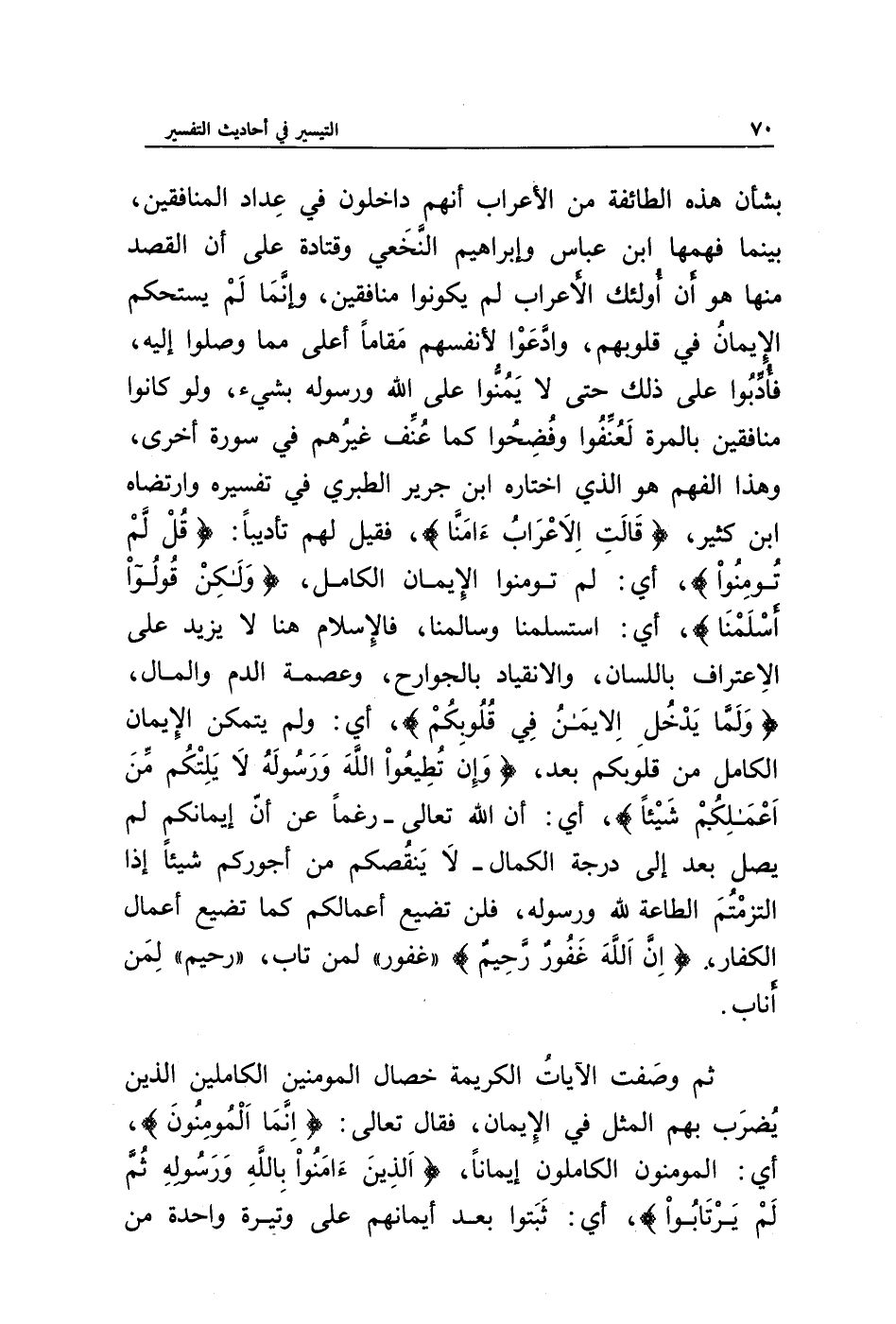 بشأن هذه الطائفة من الأعراب أنهم داخلون في عداد المنافقين، بينما فهمها ابن عباس وإبراهيم النخعي وقتادة على أن القصد منها هو أن أولئك الأعراب لم يكونوا منافقين، وإنما لم يستحكم الإيمان في قلوبهم، وادعوا لأنفسهم مقاما أعلى مما وصلوا إليه، فأدّبوا على ذلك حتى لا يمنوا على الله ورسوله بشيء، ولو كانوا منافقين بالمرة لعنفوا وفضحوا كما عنف غيرهم في سورة أخرى، وهذا الفهم هو الذي اختاره ابن جرير الطبري في تفسيره وارتضاه ابن كثير، {قَالَتِ الْأَعْرَابُ آمَنَّا}، فقيل لهم تأديبا: {قُلْ لَمْ تُؤْمِنُوا}، أي: لم تؤمنوا الإيمان الكامل، {وَلَكِنْ قُولُوا أَسْلَمْنَا}، أي استسلمنا وسالمنا، فالإسلام هنا لا يزيد على الاعتراف باللسان، والانقياد والجوارح، وعصمة الدم والمال، {وَلَمَّا يَدْخُلِ الْإِيمَانُ فِي قُلُوبِكُمْ}، أي ولم يتمكن الإيمان الكامل من قلوبكم بعد، {وَإِنْ تُطِيعُوا اللَّهَ وَرَسُولَهُ لَا يَلِتْكُمْ مِنْ أَعْمَالِكُمْ شَيْئًا}، أي أن الله تعالى -رغما عن أن إيمانكم لم يصل بعد إلى درجة الكمال- لا ينقصكم من أجوركم شيئا إذا التزمتم الطاعة لله ورسوله، فلن تضيع أعمالكم كما تضيع أعمال الكفار، {إِنَّ اللَّهَ غَفُورٌ رَحِيمٌ} " غفور " لمن تاب، " رحيم " لمن أناب.