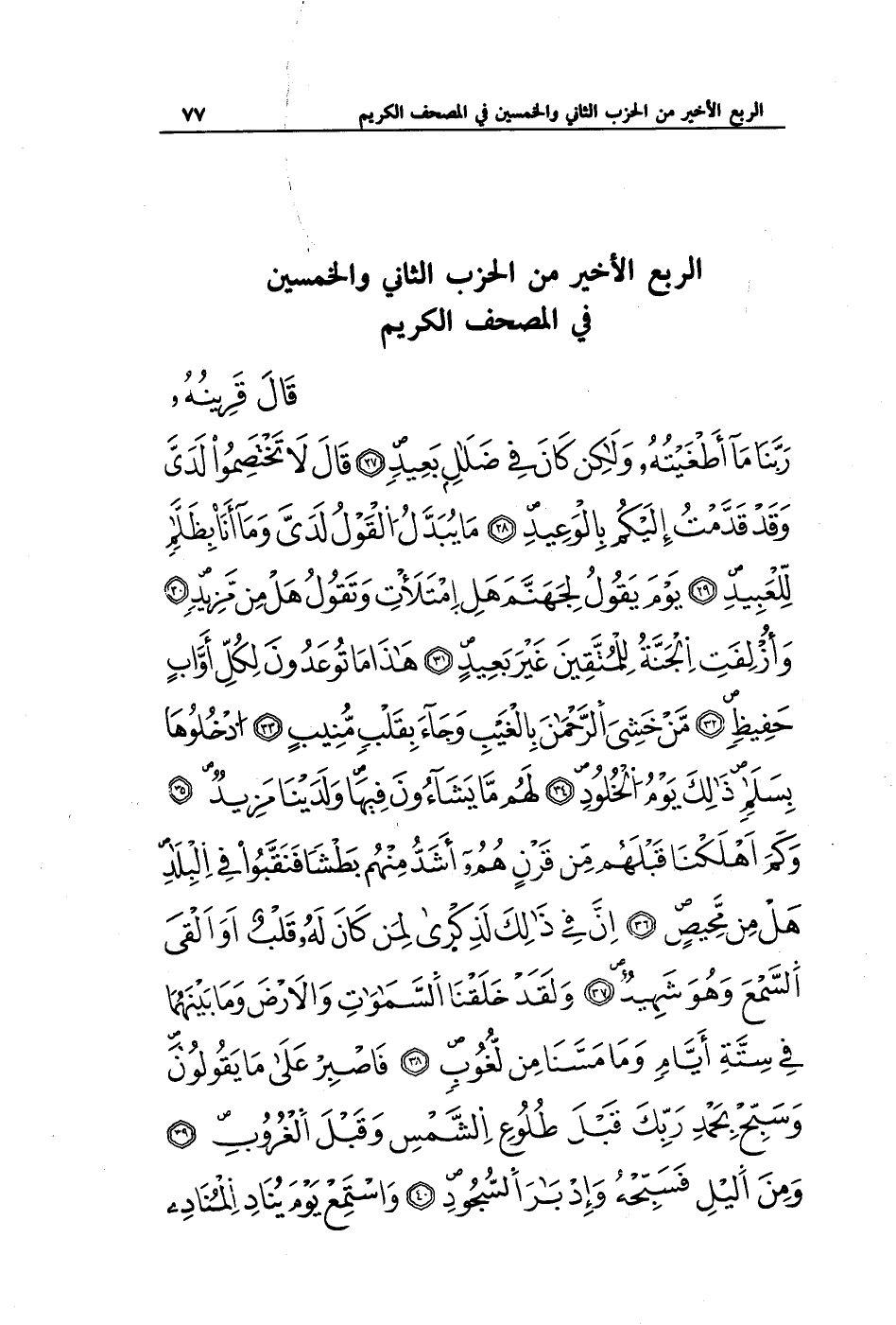 وَقَالَ قَرِينُهُ هَذَا مَا لَدَيَّ عَتِيدٌ (23) أَلْقِيَا فِي جَهَنَّمَ كُلَّ كَفَّارٍ عَنِيدٍ (24) مَنَّاعٍ لِلْخَيْرِ مُعْتَدٍ مُرِيبٍ (25) الَّذِي جَعَلَ مَعَ اللَّهِ إِلَهًا آخَرَ فَأَلْقِيَاهُ فِي الْعَذَابِ الشَّدِيدِ (26) قَالَ قَرِينُهُ رَبَّنَا مَا أَطْغَيْتُهُ وَلَكِنْ كَانَ فِي ضَلَالٍ بَعِيدٍ (27) قَالَ لَا تَخْتَصِمُوا لَدَيَّ وَقَدْ قَدَّمْتُ إِلَيْكُمْ بِالْوَعِيدِ (28) مَا يُبَدَّلُ الْقَوْلُ لَدَيَّ وَمَا أَنَا بِظَلَّامٍ لِلْعَبِيدِ (29) يَوْمَ نَقُولُ لِجَهَنَّمَ هَلِ امْتَلَأْتِ وَتَقُولُ هَلْ مِنْ مَزِيدٍ (30) وَأُزْلِفَتِ الْجَنَّةُ لِلْمُتَّقِينَ غَيْرَ بَعِيدٍ (31) هَذَا مَا تُوعَدُونَ لِكُلِّ أَوَّابٍ حَفِيظٍ (32) مَنْ خَشِيَ الرَّحْمَنَ بِالْغَيْبِ وَجَاءَ بِقَلْبٍ مُنِيبٍ (33) ادْخُلُوهَا بِسَلَامٍ ذَلِكَ يَوْمُ الْخُلُودِ (34) لَهُمْ مَا يَشَاءُونَ فِيهَا وَلَدَيْنَا مَزِيدٌ (35) وَكَمْ أَهْلَكْنَا قَبْلَهُمْ مِنْ قَرْنٍ هُمْ أَشَدُّ مِنْهُمْ بَطْشًا فَنَقَّبُوا فِي الْبِلَادِ هَلْ مِنْ مَحِيصٍ (36) إِنَّ فِي ذَلِكَ لَذِكْرَى لِمَنْ كَانَ لَهُ قَلْبٌ أَوْ أَلْقَى السَّمْعَ وَهُوَ شَهِيدٌ (37) وَلَقَدْ خَلَقْنَا السَّمَاوَاتِ وَالْأَرْضَ وَمَا بَيْنَهُمَا فِي سِتَّةِ أَيَّامٍ وَمَا مَسَّنَا مِنْ لُغُوبٍ (38) فَاصْبِرْ عَلَى مَا يَقُولُونَ وَسَبِّحْ بِحَمْدِ رَبِّكَ قَبْلَ طُلُوعِ الشَّمْسِ وَقَبْلَ الْغُرُوبِ (39) وَمِنَ اللَّيْلِ فَسَبِّحْهُ وَأَدْبَارَ السُّجُودِ (40) وَاسْتَمِعْ يَوْمَ يُنَادِ الْمُنَادِ