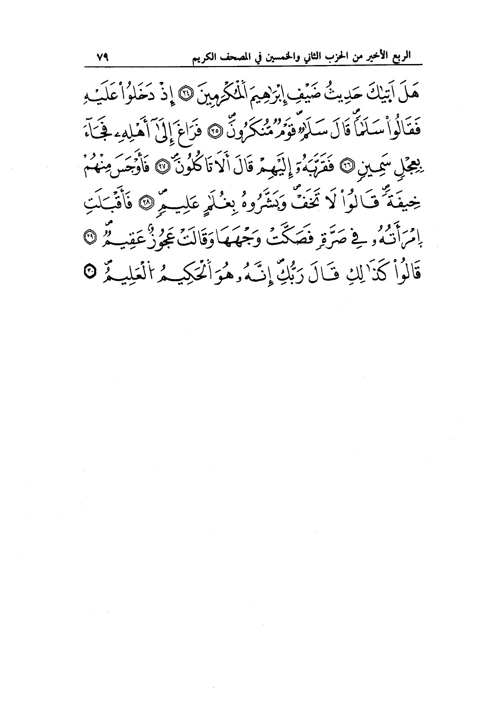 هَلْ أَتَاكَ حَدِيثُ ضَيْفِ إِبْرَاهِيمَ الْمُكْرَمِينَ (24) إِذْ دَخَلُوا عَلَيْهِ فَقَالُوا سَلَامًا قَالَ سَلَامٌ قَوْمٌ مُنْكَرُونَ (25) فَرَاغَ إِلَى أَهْلِهِ فَجَاءَ بِعِجْلٍ سَمِينٍ (26) فَقَرَّبَهُ إِلَيْهِمْ قَالَ أَلَا تَأْكُلُونَ (27) فَأَوْجَسَ مِنْهُمْ خِيفَةً قَالُوا لَا تَخَفْ وَبَشَّرُوهُ بِغُلَامٍ عَلِيمٍ (28) فَأَقْبَلَتِ امْرَأَتُهُ فِي صَرَّةٍ فَصَكَّتْ وَجْهَهَا وَقَالَتْ عَجُوزٌ عَقِيمٌ (29) قَالُوا كَذَلِكِ قَالَ رَبُّكِ إِنَّهُ هُوَ الْحَكِيمُ الْعَلِيمُ (30)